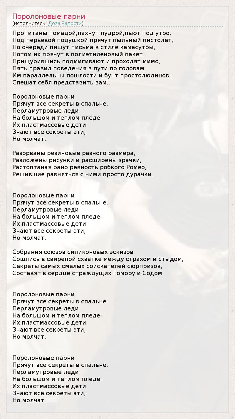 Пропитаны помадой,пахнут пудрой,пьют под утро, Под перьевой подушкой прячут пыльный пистолет, По очереди пишут письма в стиле камасутры, Потом их прячут в полиэтиленовый пакет. Прищурившись,подмигивают и проходят мимо, Пять правил поведения в пути по головам, Им параллельны пошлости и бунт простолюдинов, Спешат себя представить вам... Поролоновые парни Прячут все секреты в спальне. Перламутровые леди На большом и теплом пледе. Их пластмассовые дети Знают все секреты эти, Но молчат. Разорваны резиновые разного размера, Разложены рисунки и расширены зрачки, Растоптаная рано ревность робкого Ромео, Решившие равняться с ними просто дурачки. Поролоновые парни Прячут все секреты в спальне. Перламутровые леди На большом и теплом пледе. Их пластмассовые дети Знают все секреты эти, Но молчат. Собрания союзов силиконовых эскизов Сошлись в свирепой схватке между страхом и стыдом, Секреты самых смелых соискателей сюрпризов, Составят в сердце страждущих Гомору и Содом. Поролоновые парни Прячут все секреты в спальне. Перламутровые леди На большом и теплом пледе. Их пластмассовые дети Знают все секреты эти, Но молчат. Поролоновые парни Прячут все секреты в спальне. Перламутровые леди На большом и теплом пледе. Их пластмассовые дети Знают все секреты эти, Но молчат.