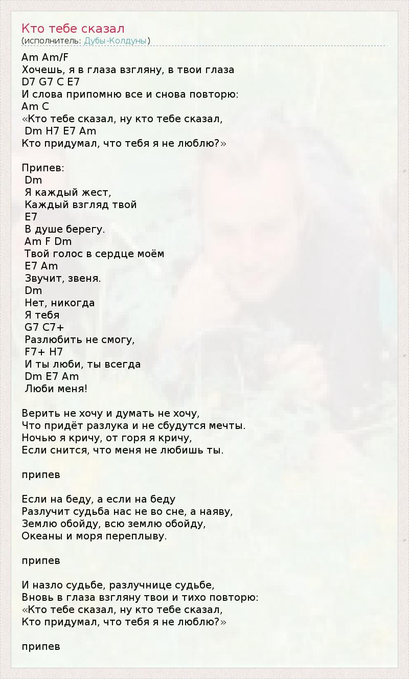 Am Am/F Хочешь, я в глаза взгляну, в твои глаза D7 G7 C E7 И слова припомню все и снова повторю: Am C «Кто тебе сказал, ну кто тебе сказал, Dm H7 E7 Am Кто придумал, что тебя я не люблю?» Припев: Dm Я каждый жест, Каждый взгляд твой E7 В душе берегу. Am F Dm Твой голос в сердце моём E7 Am Звучит, звеня. Dm Нет, никогда Я тебя G7 C7+ Разлюбить не смогу, F7+ H7 И ты люби, ты всегда Dm E7 Am Люби меня! Верить не хочу и думать не хочу, Что придёт разлука и не сбудутся мечты. Ночью я кричу, от горя я кричу, Если снится, что меня не любишь ты. припев Если на беду, а если на беду Разлучит судьба нас не во сне, а наяву, Землю обойду, всю землю обойду, Океаны и моря переплыву. припев И назло судьбе, разлучнице судьбе, Вновь в глаза взгляну твои и тихо повторю: «Кто тебе сказал, ну кто тебе сказал, Кто придумал, что тебя я не люблю?» припев