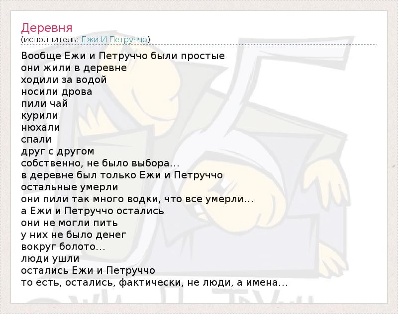 Вообще Ежи и Петруччо были простые они жили в деревне ходили за водой носили дрова пили чай курили нюхали спали друг с другом собственно, не было выбора… в деревне был только Ежи и Петруччо остальные умерли они пили так много водки, что все умерли… а Ежи и Петруччо остались они не могли пить у них не было денег вокруг болото… люди ушли остались Ежи и Петруччо то есть, остались, фактически, не люди, а имена…