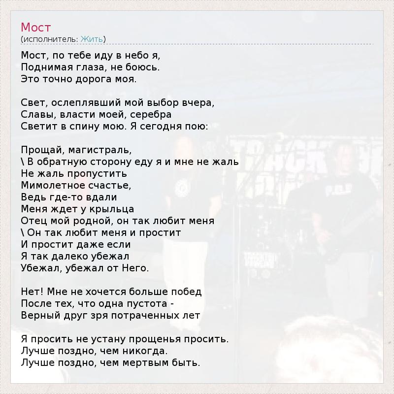Мост, по тебе иду в небо я, Поднимая глаза, не боюсь. Это точно дорога моя. Свет, ослеплявший мой выбор вчера, Славы, власти моей, серебра Светит в спину мою. Я сегодня пою: Прощай, магистраль, \ В обратную сторону еду я и мне не жаль Не жаль пропустить Мимолетное счастье, Ведь где-то вдали Меня ждет у крыльца Отец мой родной, он так любит меня \ Он так любит меня и простит И простит даже если Я так далеко убежал Убежал, убежал от Него. Нет! Мне не хочется больше побед После тех, что одна пустота - Верный друг зря потраченных лет Я просить не устану прощенья просить. Лучше поздно, чем никогда. Лучше поздно, чем мертвым быть.
