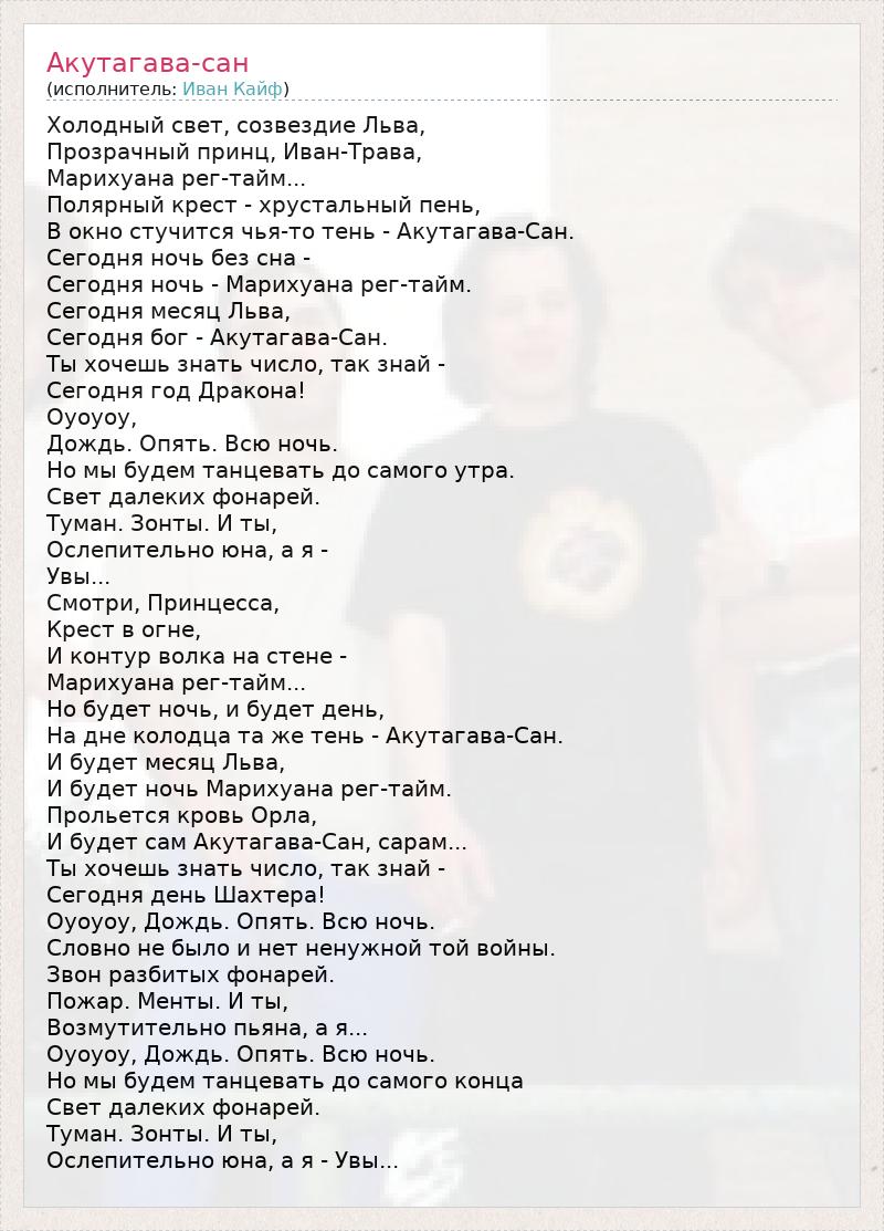 Холодный свет, созвездие Льва, Прозрачный принц, Иван-Трава, Марихуана рег-тайм... Полярный крест - хрустальный пень, В окно стучится чья-то тень - Акутагава-Сан. Сегодня ночь без сна - Сегодня ночь - Марихуана рег-тайм. Сегодня месяц Льва, Сегодня бог - Акутагава-Сан. Ты хочешь знать число, так знай - Сегодня год Дракона! Оуоуоу, Дождь. Опять. Всю ночь. Но мы будем танцевать до самого утра. Свет далеких фонарей. Туман. Зонты. И ты, Ослепительно юна, а я - Увы... Смотри, Принцесса, Крест в огне, И контур волка на стене - Марихуана рег-тайм... Но будет ночь, и будет день, На дне колодца та же тень - Акутагава-Сан. И будет месяц Льва, И будет ночь Марихуана рег-тайм. Прольется кровь Орла, И будет сам Акутагава-Сан, сарам... Ты хочешь знать число, так знай - Сегодня день Шахтера! Оуоуоу, Дождь. Опять. Всю ночь. Словно не было и нет ненужной той войны. Звон разбитых фонарей. Пожар. Менты. И ты, Возмутительно пьяна, а я... Оуоуоу, Дождь. Опять. Всю ночь. Но мы будем танцевать до самого конца Свет далеких фонарей. Туман. Зонты. И ты, Ослепительно юна, а я - Увы...