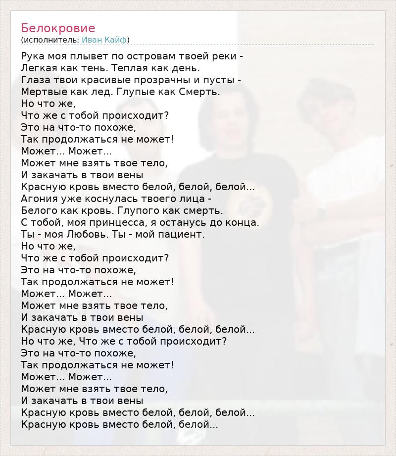 Рука моя плывет по островам твоей реки - Легкая как тень. Теплая как день. Глаза твои красивые прозрачны и пусты - Мертвые как лед. Глупые как Смерть. Но что же, Что же с тобой происходит? Это на что-то похоже, Так продолжаться не может! Может... Может... Может мне взять твое тело, И закачать в твои вены Красную кровь вместо белой, белой, белой... Агония уже коснулась твоего лица - Белого как кровь. Глупого как смерть. С тобой, моя принцесса, я останусь до конца. Ты - моя Любовь. Ты - мой пациент. Но что же, Что же с тобой происходит? Это на что-то похоже, Так продолжаться не может! Может... Может... Может мне взять твое тело, И закачать в твои вены Красную кровь вместо белой, белой, белой... Но что же, Что же с тобой происходит? Это на что-то похоже, Так продолжаться не может! Может... Может... Может мне взять твое тело, И закачать в твои вены Красную кровь вместо белой, белой, белой... Красную кровь вместо белой, белой...