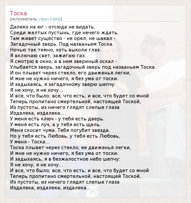 Далеко на юг - отсюда не видать. Среди желтых пустынь, где нечего ждать. Там живет существо - не орел, не шакал - Загадочный зверь. Под названьем Тоска. Ночью так темно, хоть выколи глаз. Я включаю свет, зажигаю газ. Я смотрю в окно, а в нем звериный оскал - Улыбается зверь, загадочный зверь под названьем Тоска. И он плывет через стекло, его движенья легки, И мне не нужно ничего, я без ума от тоски. И задыхаясь, я загадочному зверю шепчу: Я не хочу, я не хочу... И все, что было; все, что есть; и все, что будет со мной Теперь пропитано смертельной, настоящей Тоской, Из пустоты, из ничего глядят слепые глаза Издалека, издалека... У меня есть ключ - у тебя есть дверь. У меня есть луч, а у тебя есть щель. Меня скосит чума. Тебя погубит звезда. Но у тебя есть Любовь, у тебя есть Любовь, У меня - Тоска... Тоска плывет через стекло, ее движенья легки, И мне не нужно ничего, я без ума от тоски. И задыхаясь, я в безжалостное небо шепчу: Я не хочу, я не хочу... И все, что было; все, что есть; и все, что будет со мной Теперь пропитано смертельной, настоящей Тоской, Из пустоты, из ничего глядят слепые глаза Издалека, издалека, издалека...