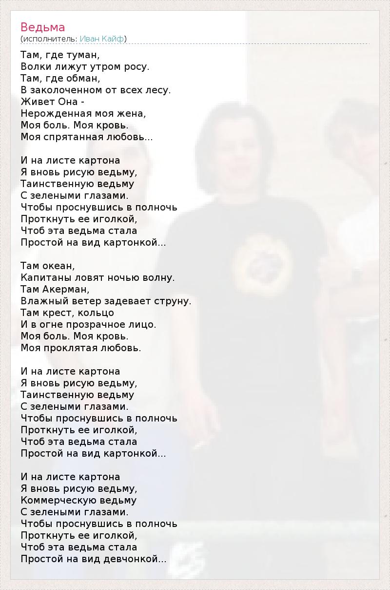 Там, где туман, Волки лижут утром росу. Там, где обман, В заколоченном от всех лесу. Живет Она - Нерожденная моя жена, Моя боль. Моя кровь. Моя спрятанная любовь... И на листе картона Я вновь рисую ведьму, Таинственную ведьму С зелеными глазами. Чтобы проснувшись в полночь Проткнуть ее иголкой, Чтоб эта ведьма стала Простой на вид картонкой... Там океан, Капитаны ловят ночью волну. Там Акерман, Влажный ветер задевает струну. Там крест, кольцо И в огне прозрачное лицо. Моя боль. Моя кровь. Моя проклятая любовь. И на листе картона Я вновь рисую ведьму, Таинственную ведьму С зелеными глазами. Чтобы проснувшись в полночь Проткнуть ее иголкой, Чтоб эта ведьма стала Простой на вид картонкой... И на листе картона Я вновь рисую ведьму, Коммерческую ведьму С зелеными глазами. Чтобы проснувшись в полночь Проткнуть ее иголкой, Чтоб эта ведьма стала Простой на вид девчонкой...