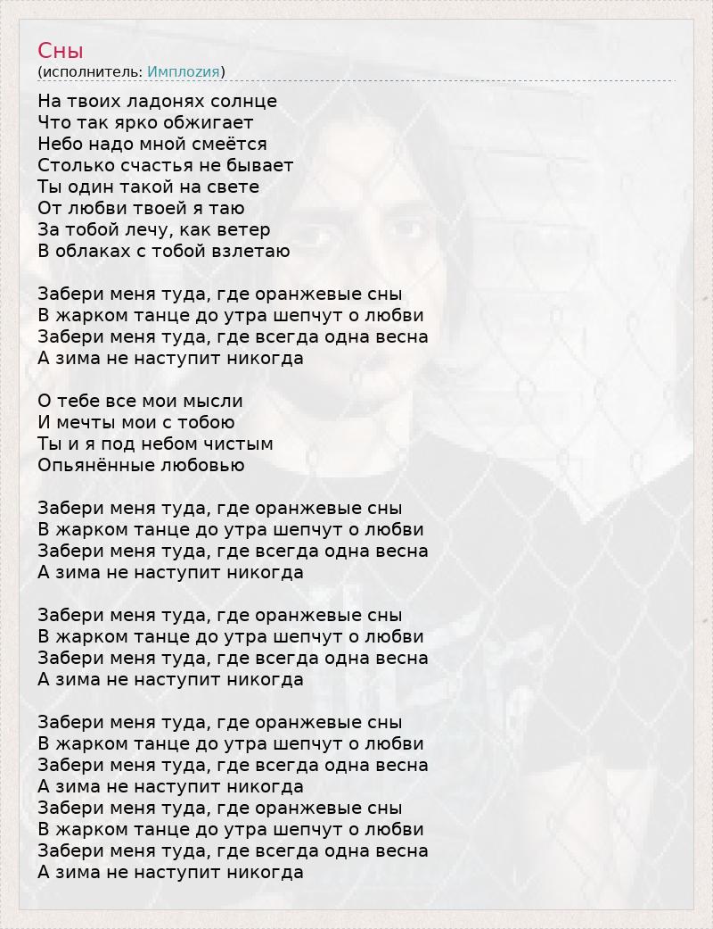 На твоих ладонях солнце Что так ярко обжигает Небо надо мной смеётся Столько счастья не бывает Ты один такой на свете От любви твоей я таю За тобой лечу, как ветер В облаках с тобой взлетаю Забери меня туда, где оранжевые сны В жарком танце до утра шепчут о любви Забери меня туда, где всегда одна весна А зима не наступит никогда О тебе все мои мысли И мечты мои с тобою Ты и я под небом чистым Опьянённые любовью Забери меня туда, где оранжевые сны В жарком танце до утра шепчут о любви Забери меня туда, где всегда одна весна А зима не наступит никогда Забери меня туда, где оранжевые сны В жарком танце до утра шепчут о любви Забери меня туда, где всегда одна весна А зима не наступит никогда Забери меня туда, где оранжевые сны В жарком танце до утра шепчут о любви Забери меня туда, где всегда одна весна А зима не наступит никогда Забери меня туда, где оранжевые сны В жарком танце до утра шепчут о любви Забери меня туда, где всегда одна весна А зима не наступит никогда