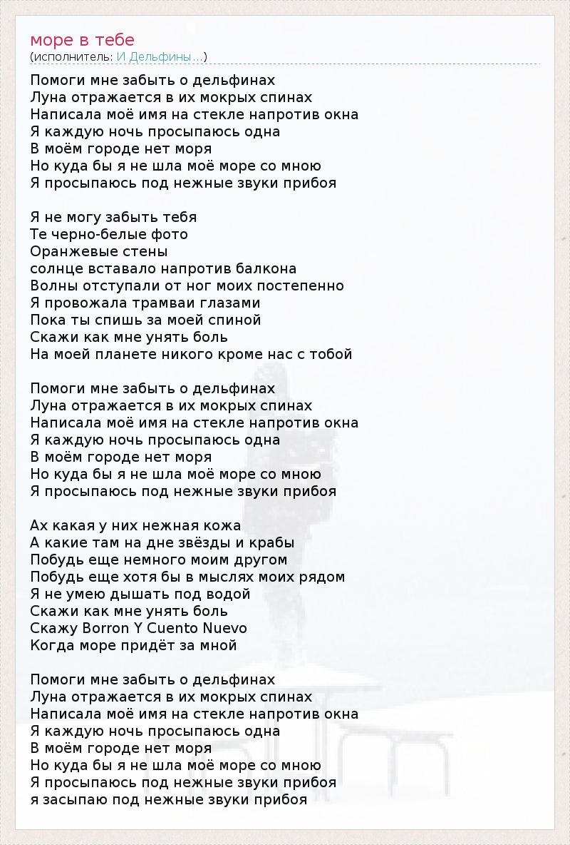 Помоги мне забыть о дельфинах Луна отражается в их мокрых спинах Написала моё имя на стекле напротив окна Я каждую ночь просыпаюсь одна В моём городе нет моря Но куда бы я не шла моё море со мною Я просыпаюсь под нежные звуки прибоя Я не могу забыть тебя Те черно-белые фото Оранжевые стены солнце вставало напротив балкона Волны отступали от ног моих постепенно Я провожала трамваи глазами Пока ты спишь за моей спиной Скажи как мне унять боль На моей планете никого кроме нас с тобой Помоги мне забыть о дельфинах Луна отражается в их мокрых спинах Написала моё имя на стекле напротив окна Я каждую ночь просыпаюсь одна В моём городе нет моря Но куда бы я не шла моё море со мною Я просыпаюсь под нежные звуки прибоя Ах какая у них нежная кожа А какие там на дне звёзды и крабы Побудь еще немного моим другом Побудь еще хотя бы в мыслях моих рядом Я не умею дышать под водой Скажи как мне унять боль Скажу Borron Y Cuento Nuevo Когда море придёт за мной Помоги мне забыть о дельфинах Луна отражается в их мокрых спинах Написала моё имя на стекле напротив окна Я каждую ночь просыпаюсь одна В моём городе нет моря Но куда бы я не шла моё море со мною Я просыпаюсь под нежные звуки прибоя я засыпаю под нежные звуки прибоя