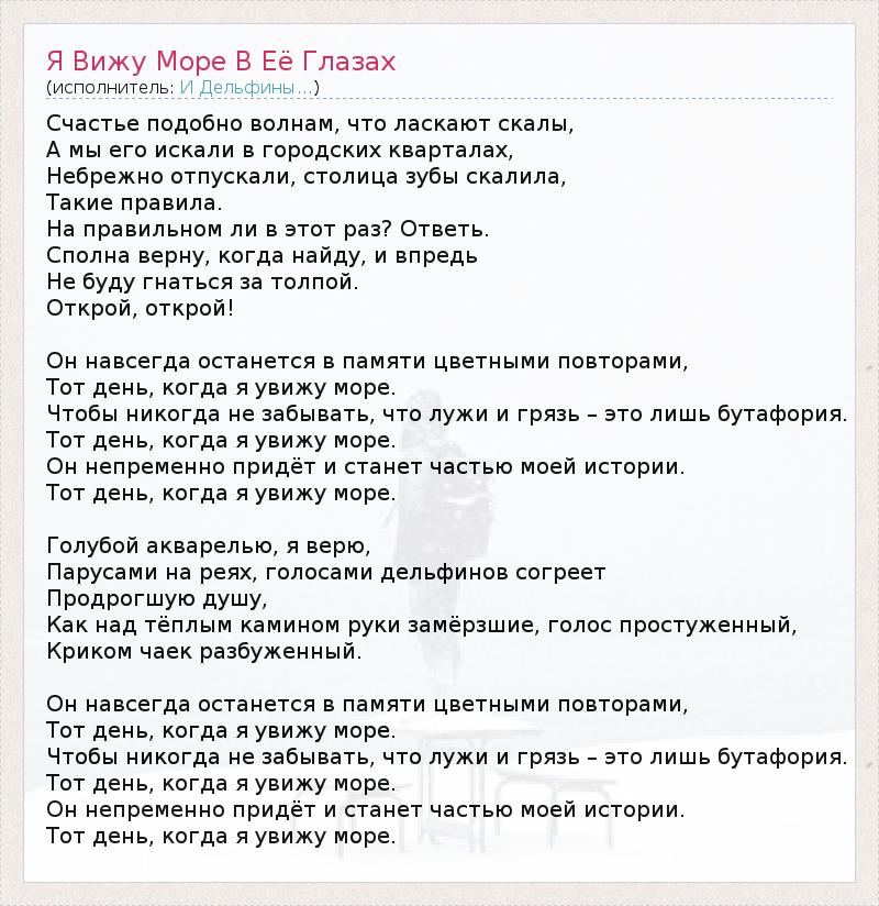 Счастье подобно волнам, что ласкают скалы, А мы его искали в городских кварталах, Небрежно отпускали, столица зубы скалила, Такие правила. На правильном ли в этот раз? Ответь. Сполна верну, когда найду, и впредь Не буду гнаться за толпой. Открой, открой! Он навсегда останется в памяти цветными повторами, Тот день, когда я увижу море. Чтобы никогда не забывать, что лужи и грязь – это лишь бутафория. Тот день, когда я увижу море. Он непременно придёт и станет частью моей истории. Тот день, когда я увижу море. Голубой акварелью, я верю, Парусами на реях, голосами дельфинов согреет Продрогшую душу, Как над тёплым камином руки замёрзшие, голос простуженный, Криком чаек разбуженный. Он навсегда останется в памяти цветными повторами, Тот день, когда я увижу море. Чтобы никогда не забывать, что лужи и грязь – это лишь бутафория. Тот день, когда я увижу море. Он непременно придёт и станет частью моей истории. Тот день, когда я увижу море.
