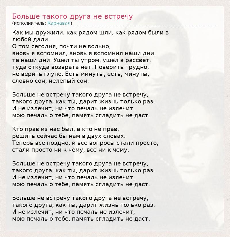 Как мы дружили, как рядом шли, как рядом были в любой дали. О том сегодня, почти не вольно, вновь я вспомнил, вновь я вспомнил наши дни, те наши дни. Ушёл ты утром, ушёл в рассвет, туда откуда возврата нет. Поверить трудно, не верить глупо. Есть минуты, есть, минуты, словно сон, нелепый сон. Больше не встречу такого друга не встречу, такого друга, как ты, дарит жизнь только раз. И не излечит, ни что печаль не излечит, мою печаль о тебе, память сгладить не даст. Кто прав из нас был, а кто не прав, решить сейчас бы нам в двух словах. Теперь все поздно, и все вопросы стали просто, стали просто ни к чему, все ни к чему. Больше не встречу такого друга не встречу, такого друга, как ты, дарит жизнь только раз. И не излечит, ни что печаль не излечит, мою печаль о тебе, память сгладить не даст. Больше не встречу такого друга не встречу, такого друга, как ты, дарит жизнь только раз. И не излечит, ни что печаль не излечит, мою печаль о тебе, память сгладить не даст.