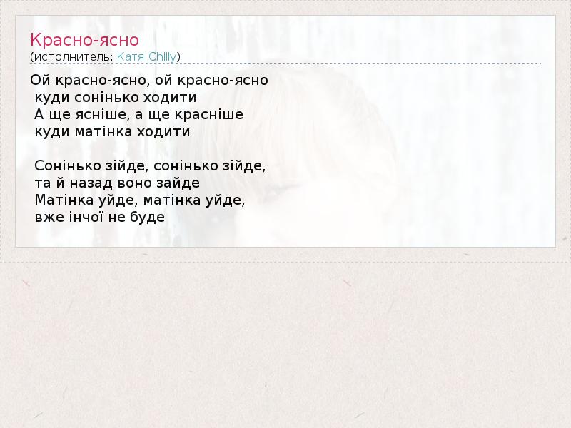 Ой красно-ясно, ой красно-ясно куди сонінько ходити А ще ясніше, а ще красніше куди матінка ходити Сонінько зійде, сонінько зійде, та й назад воно зайде Матінка уйде, матінка уйде, вже інчої не буде