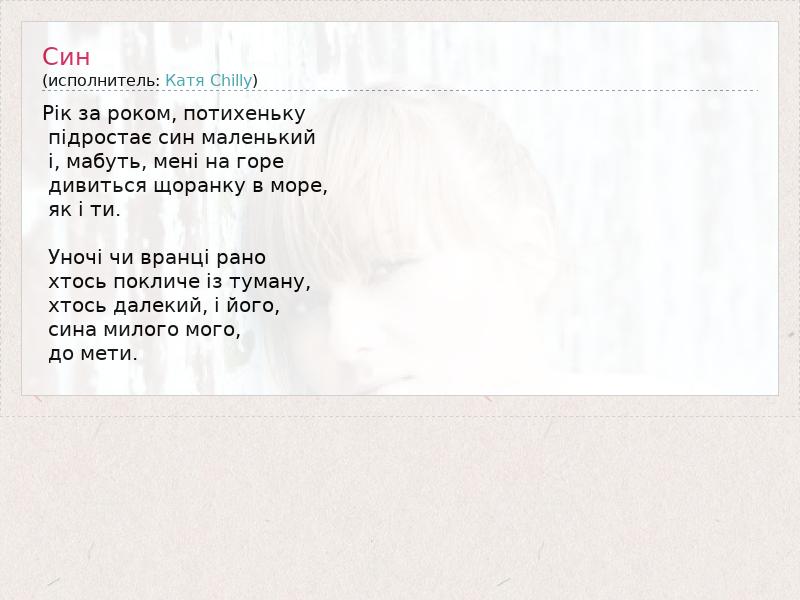 Рік за роком, потихеньку підростає син маленький і, мабуть, мені на горе дивиться щоранку в море, як і ти. Уночі чи вранці рано хтось покличе із туману, хтось далекий, і його, сина милого мого, до мети.