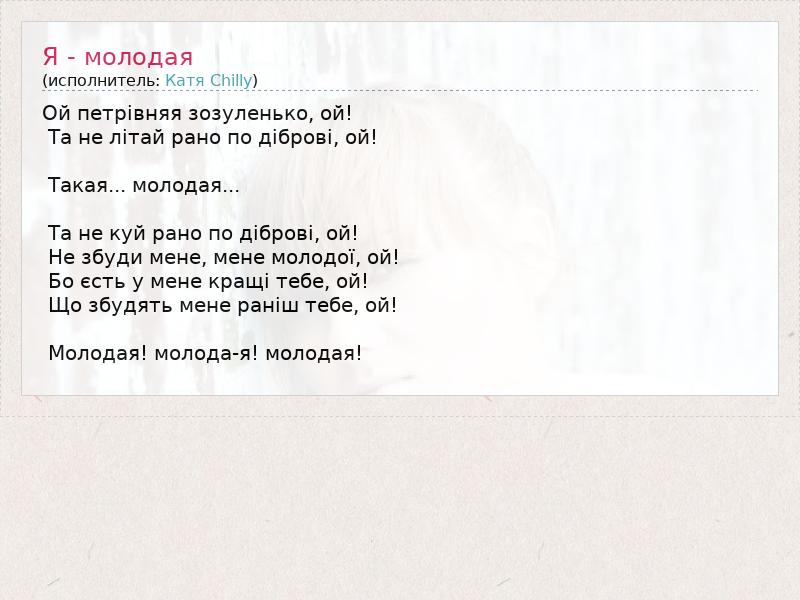 Ой петрівняя зозуленько, ой! Та не літай рано по діброві, ой! Такая... молодая... Та не куй рано по діброві, ой! Не збуди мене, мене молодої, ой! Бо єсть у мене кращі тебе, ой! Що збудять мене раніш тебе, ой! Молодая! молода-я! молодая!