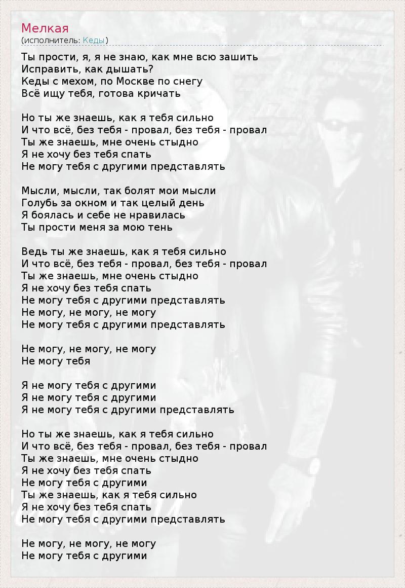 Ты прости, я, я не знаю, как мне всю зашить Исправить, как дышать? Кеды с мехом, по Москве по снегу Всё ищу тебя, готова кричать Но ты же знаешь, как я тебя сильно И что всё, без тебя - провал, без тебя - провал Ты же знаешь, мне очень стыдно Я не хочу без тебя спать Не могу тебя с другими представлять Мысли, мысли, так болят мои мысли Голубь за окном и так целый день Я боялась и себе не нравилась Ты прости меня за мою тень Ведь ты же знаешь, как я тебя сильно И что всё, без тебя - провал, без тебя - провал Ты же знаешь, мне очень стыдно Я не хочу без тебя спать Не могу тебя с другими представлять Не могу, не могу, не могу Не могу тебя с другими представлять Не могу, не могу, не могу Не могу тебя Я не могу тебя с другими Я не могу тебя с другими Я не могу тебя с другими представлять Но ты же знаешь, как я тебя сильно И что всё, без тебя - провал, без тебя - провал Ты же знаешь, мне очень стыдно Я не хочу без тебя спать Не могу тебя с другими Ты же знаешь, как я тебя сильно Я не хочу без тебя спать Не могу тебя с другими представлять Не могу, не могу, не могу Не могу тебя с другими