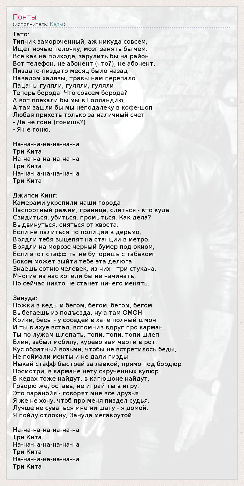 Тато: Типчик замороченный, аж никуда совсем, Ищет ночью телочку, мозг занять бы чем. Все как на приходе, зарулить бы на район Вот телефон, не абонент (что?), не абонент. Пиздато-пиздато месяц было назад Навалом халявы, травы нам перепало. Пацаны гуляли, гуляли, гуляли Теперь борода. Что совсем борода? А вот поехали бы мы в Голландию, А там зашли бы мы неподалеку в кофе-шоп Любая прихоть только за наличный счет - Да не гони (гонишь?) - Я не гоню. На-на-на-на-на-на-на Три Кита На-на-на-на-на-на-на Три Кита На-на-на-на-на-на-на Три Кита Джипси Кинг: Камерами укрепили наши города Паспортный режим, граница, слиться - кто куда Свидиться, убиться, промыться. Как дела? Выдвинуться, сняться от хвоста. Если не палиться по полиции в дерьмо, Врядли тебя выцепят на станции в метро. Врядли на морозе черный бумер под окном, Если этот стафф ты не буторишь с табаком. Боком может выйти тебе эта делюга Знаешь сотню человек, из них - три стукача. Многие из нас хотели бы не начинать, Но сейчас никто не станет ничего менять. Зануда: Ножки в кеды и бегом, бегом, бегом, бегом. Выбегаешь из подъезда, ну а там ОМОН. Крики, бесы - у соседей в хате полный шмон И ты в ахуе встал, вспомнив вдруг про карман. Ты по лужам шлепать, топи, топи, топи шлеп Блин, забыл мобилу, курево вам черти в рот. Кус обратный возьми, чтобы не встретилось беды, Не поймали менты и не дали пизды. Ныкай стафф быстрей за лавкой, прямо под бордюр Посмотри, в кармане нету скрученных купюр. В кедах тоже найдут, в капюшоне найдут, Говорю же, оставь, не играй ты в игру. Это паранойя - говорят мне все друзья. Я же не хочу, чтоб про меня пиздел судья. Лучше не суваться мне ни шагу - я домой, Я пойду отдохну, Зануда мегакрутой. На-на-на-на-на-на-на Три Кита На-на-на-на-на-на-на Три Кита На-на-на-на-на-на-на Три Кита