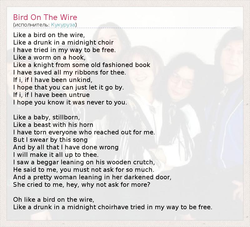Like a bird on the wire, Like a drunk in a midnight choir I have tried in my way to be free. Like a worm on a hook, Like a knight from some old fashioned book I have saved all my ribbons for thee. If i, if I have been unkind, I hope that you can just let it go by. If i, if I have been untrue I hope you know it was never to you. Like a baby, stillborn, Like a beast with his horn I have torn everyone who reached out for me. But I swear by this song And by all that I have done wrong I will make it all up to thee. I saw a beggar leaning on his wooden crutch, He said to me, you must not ask for so much. And a pretty woman leaning in her darkened door, She cried to me, hey, why not ask for more? Oh like a bird on the wire, Like a drunk in a midnight choirhave tried in my way to be free.
