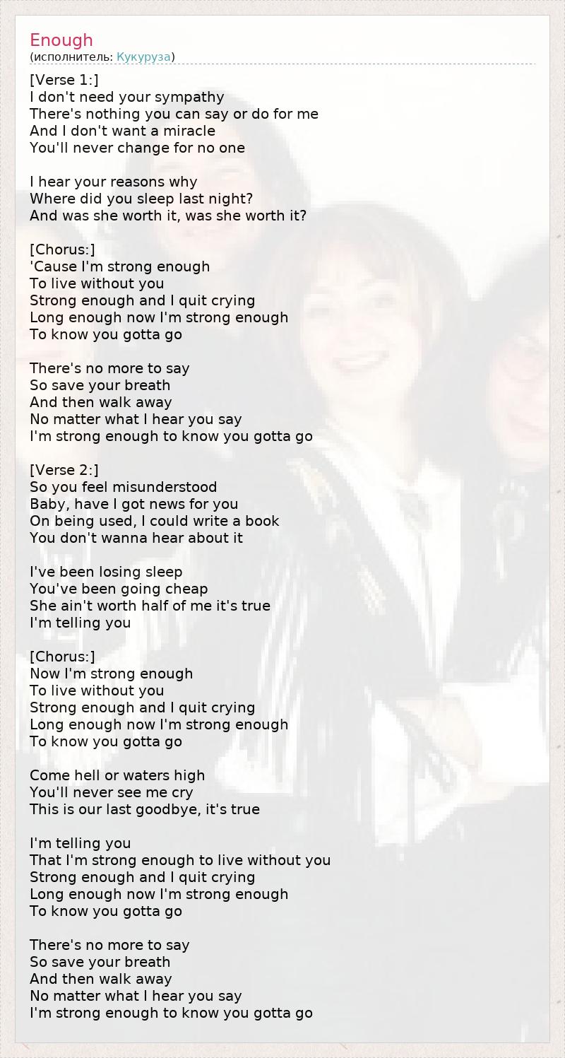 [Verse 1:] I don't need your sympathy There's nothing you can say or do for me And I don't want a miracle You'll never change for no one I hear your reasons why Where did you sleep last night? And was she worth it, was she worth it? [Chorus:] 'Cause I'm strong enough To live without you Strong enough and I quit crying Long enough now I'm strong enough To know you gotta go There's no more to say So save your breath And then walk away No matter what I hear you say I'm strong enough to know you gotta go [Verse 2:] So you feel misunderstood Baby, have I got news for you On being used, I could write a book You don't wanna hear about it I've been losing sleep You've been going cheap She ain't worth half of me it's true I'm telling you [Chorus:] Now I'm strong enough To live without you Strong enough and I quit crying Long enough now I'm strong enough To know you gotta go Come hell or waters high You'll never see me cry This is our last goodbye, it's true I'm telling you That I'm strong enough to live without you Strong enough and I quit crying Long enough now I'm strong enough To know you gotta go There's no more to say So save your breath And then walk away No matter what I hear you say I'm strong enough to know you gotta go