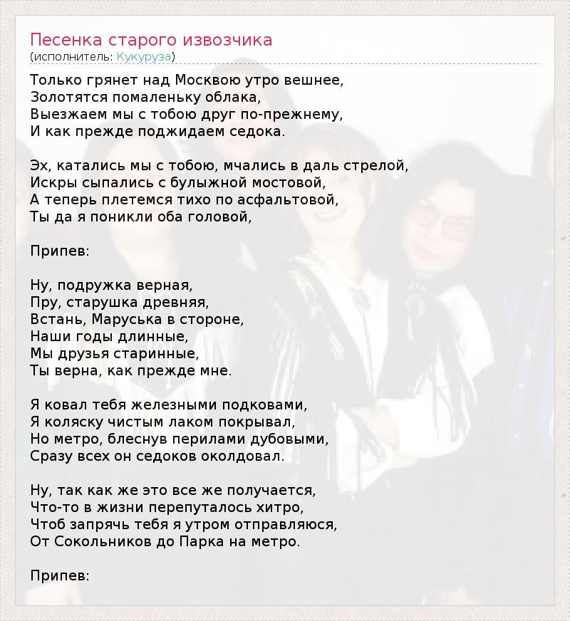 Just break out over Moscow vernal morning , Golden clouds gradually , We leave with you each still , And as before waiting for a fare . Oh, we rode with you, raced into the distance boom Sparks fell to the cobbles Now Scourge quietly along the asphalt , You and I both drooping head, Chorus: Well, loyal friend , Proulx , the old lady ancient, Arise, Maruska aside Our long years , We're friends of old , You are correct, as before me . I forged you iron horseshoes , I stroller clean lacquered covers, But the subway , flashing oak railings , Once all the riders he bewitched . So, how does this all turns out , Something in life is confused tricky To harness you in the morning , I submit , From Sokolniki Park to the subway . Chorus: