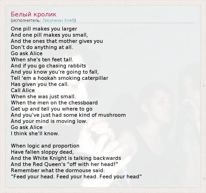 One pill makes you larger And one pill makes you small, And the ones that mother gives you Don't do anything at all. Go ask Alice When she's ten feet tall. And if you go chasing rabbits And you know you're going to fall, Tell 'em a hookah smoking caterpillar Has given you the call. Call Alice When she was just small. When the men on the chessboard Get up and tell you where to go And you've just had some kind of mushroom And your mind is moving low. Go ask Alice I think she'll know. When logic and proportion Have fallen sloppy dead, And the White Knight is talking backwards And the Red Queen's "off with her head!" Remember what the dormouse said: "Feed your head. Feed your head. Feed your head"