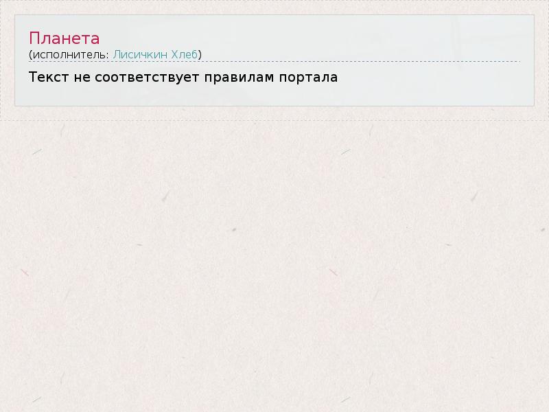 Sparkles planet Annette sides of evil and of gold. And in every moment of my - of a second, the same stigmata. Steel ropes of nerves go to the meridians, And pine branches legs dropping their median. When gods die, their remains on the memory. When people die, they often die as a creature! When the animals die, their shadows converge in the cross. When the faithful die, any option is appropriate. Look, turtle - shell mountain Bears the entire globe. Moves slowly, silently creeps, All of us know at perechёt. Vague landscapes of my obscure streets. We stayed one day, even on the brink of dawn woke up. You ask someone's opinion, what was it like? Palm Sunday and abandoned temple in Cambodia. Well, here in the glacier area, where the star is not audible prompts. It does not look bad manners to mix other colors. Flowerbeds, graves, clubs, clothes thrown down And the blood dissolves the cube, the cube of my hope. Look, turtle - shell mountain Bears the entire globe. Moves slowly, silently creeps, All of us know at perechёt. And so everything is happening on one of the smallest home - My favorite hero - & quot; & quot ;, Godzilla's favorite word - & quot; Let's go & quot;! Gulp Zemfira - where Lydia again and nailed to the flocks. Planet Neta does not see, does not feel and does not know. Rock Band will be the rider, votknёtsya plug in a guitar, Go to Lobazov Gastarbeiter, kill him shtreik-brekher. He falls asleep in thee Cosmos and mangrove grove panda anthracite nose sniffs, losing track of Childe Roland. Look, turtle - shell mountain Bears the entire globe. Moves slowly, silently creeps, All of us know at perechёt. In truth armor bears a heavy burden. There's duty and love of an alliance. She loves the river, fёrdy, sea Even a guy like me ... And once again - here's a mall, confused on the road, Where hatred stekleneya were my rhinos, Crusaders were my losing spears and helmets. The world has solved all the problems, leaving only one question. Fire Island Konkovo and any silhouette. Cool? over cool! and I'm grateful for it all. One in the middle of the zoo, a zoo on a background, The second and third arch, cut border ... WOW!