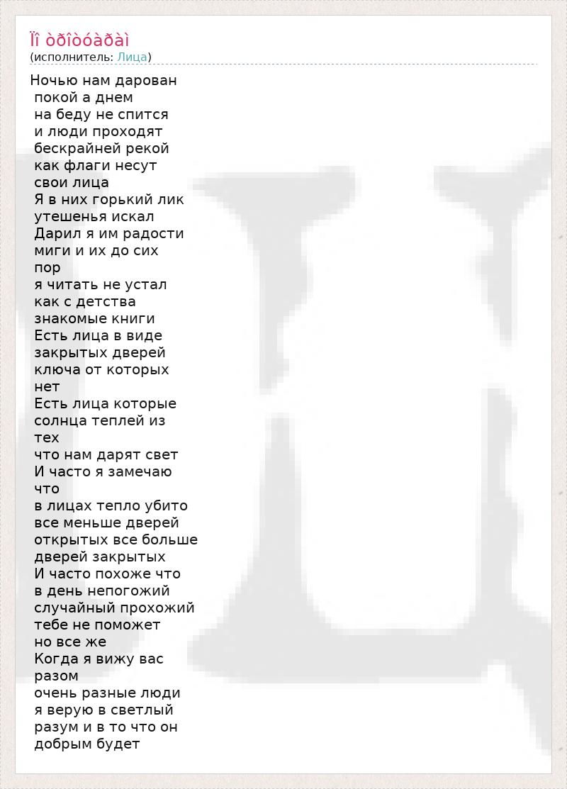 Ночью нам дарован покой а днем на беду не спится и люди проходят бескрайней рекой как флаги несут свои лица Я в них горький лик утешенья искал Дарил я им радости миги и их до сих пор я читать не устал как с детства знакомые книги Есть лица в виде закрытых дверей ключа от которых нет Есть лица которые солнца теплей из тех что нам дарят свет И часто я замечаю что в лицах тепло убито все меньше дверей открытых все больше дверей закрытых И часто похоже что в день непогожий случайный прохожий тебе не поможет но все же Когда я вижу вас разом очень разные люди я верую в светлый разум и в то что он добрым будет