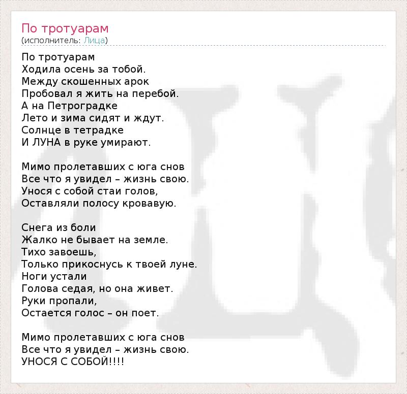 По тротуарам Ходила осень за тобой. Между скошенных арок Пробовал я жить на перебой. А на Петроградке Лето и зима сидят и ждут. Солнце в тетрадке И ЛУНА в руке умирают. Мимо пролетавших с юга снов Все что я увидел – жизнь свою. Унося с собой стаи голов, Оставляли полосу кровавую. Снега из боли Жалко не бывает на земле. Тихо завоешь, Только прикоснусь к твоей луне. Ноги устали Голова седая, но она живет. Руки пропали, Остается голос – он поет. Мимо пролетавших с юга снов Все что я увидел – жизнь свою. УНОСЯ С СОБОЙ!!!!