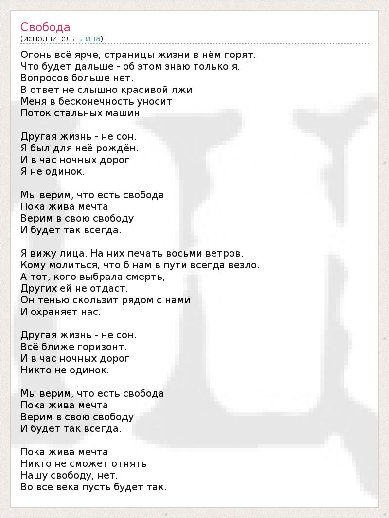 Огонь всё ярче, страницы жизни в нём горят. Что будет дальше - об этом знаю только я. Вопросов больше нет. В ответ не слышно красивой лжи. Меня в бесконечность уносит Поток стальных машин Другая жизнь - не сон. Я был для неё рождён. И в час ночных дорог Я не одинок. Мы верим, что есть свобода Пока жива мечта Верим в свою свободу И будет так всегда. Я вижу лица. На них печать восьми ветров. Кому молиться, что б нам в пути всегда везло. А тот, кого выбрала смерть, Других ей не отдаст. Он тенью скользит рядом с нами И охраняет нас. Другая жизнь - не сон. Всё ближе горизонт. И в час ночных дорог Никто не одинок. Мы верим, что есть свобода Пока жива мечта Верим в свою свободу И будет так всегда. Пока жива мечта Никто не сможет отнять Нашу свободу, нет. Во все века пусть будет так.
