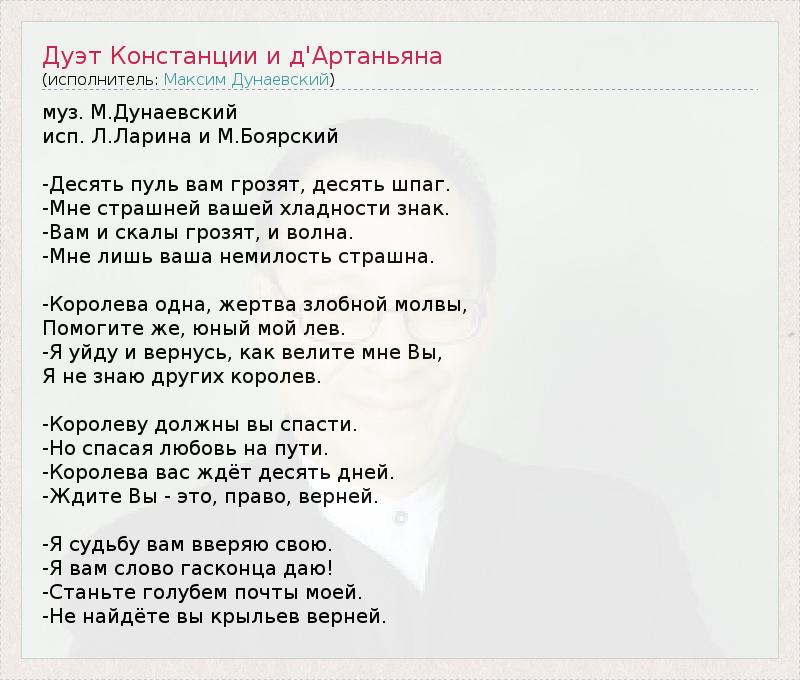 муз. М.Дунаевский исп. Л.Ларина и М.Боярский -Десять пуль вам грозят, десять шпаг. -Мне страшней вашей хладности знак. -Вам и скалы грозят, и волна. -Мне лишь ваша немилость страшна. -Королева одна, жертва злобной молвы, Помогите же, юный мой лев. -Я уйду и вернусь, как велите мне Вы, Я не знаю других королев. -Королеву должны вы спасти. -Но спасая любовь на пути. -Королева вас ждёт десять дней. -Ждите Вы - это, право, верней. -Я судьбу вам вверяю свою. -Я вам слово гасконца даю! -Станьте голубем почты моей. -Не найдёте вы крыльев верней.