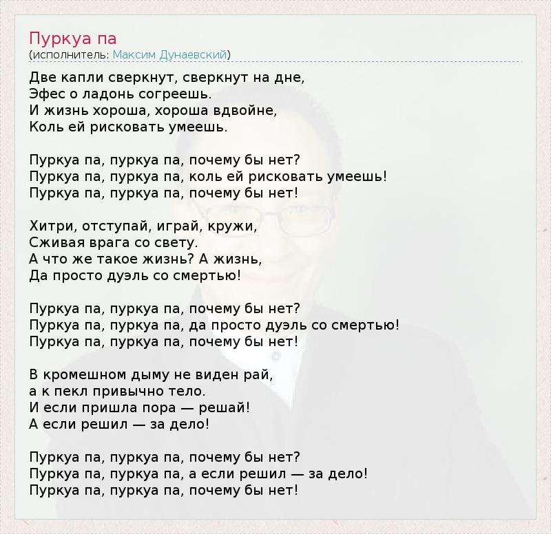 Две капли сверкнут, сверкнут на дне, Эфес о ладонь согреешь. И жизнь хороша, хороша вдвойне, Коль ей рисковать умеешь. Пуркуа па, пуркуа па, почему бы нет? Пуркуа па, пуркуа па, коль ей рисковать умеешь! Пуркуа па, пуркуа па, почему бы нет! Хитри, отступай, играй, кружи, Сживая врага со свету. А что же такое жизнь? А жизнь, Да просто дуэль со смертью! Пуркуа па, пуркуа па, почему бы нет? Пуркуа па, пуркуа па, да просто дуэль со смертью! Пуркуа па, пуркуа па, почему бы нет! В кромешном дыму не виден рай, а к пекл привычно тело. И если пришла пора — решай! А если решил — за дело! Пуркуа па, пуркуа па, почему бы нет? Пуркуа па, пуркуа па, а если решил — за дело! Пуркуа па, пуркуа па, почему бы нет!