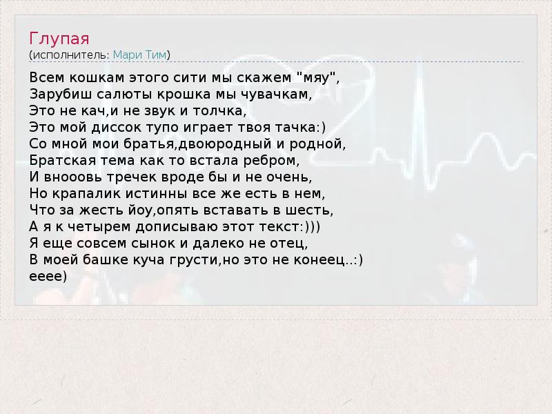 Всем кошкам этого сити мы скажем "мяу", Зарубиш салюты крошка мы чувачкам, Это не кач,и не звук и толчка, Это мой диссок тупо играет твоя тачка:) Со мной мои братья,двоюродный и родной, Братская тема как то встала ребром, И внооовь тречек вроде бы и не очень, Но крапалик истинны все же есть в нем, Что за жесть йоу,опять вставать в шесть, А я к четырем дописываю этот текст:))) Я еще совсем сынок и далеко не отец, В моей башке куча грусти,но это не конеец..:) eeee)