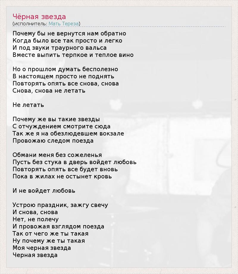 Почему бы не вернутся нам обратно Когда было все так просто и легко И под звуки траурного вальса Вместе выпить терпкое и теплое вино Но о прошлом думать бесполезно В настоящем просто не поднять Повторять опять все снова, снова Снова, снова не летать Не летать Почему же вы такие звезды С отчуждением смотрите сюда Так же я на обезлюдевшем вокзале Провожаю следом поезда Обмани меня без сожеленья Пусть без стука в дверь войдет любовь Повторять опять все будет вновь Пока в жилах не остынет кровь И не войдет любовь Устрою праздник, зажгу свечу И снова, снова Нет, не полечу И провожая взглядом поезда Так от чего же ты такая Ну почему же ты такая Моя черная звезда Черная звезда