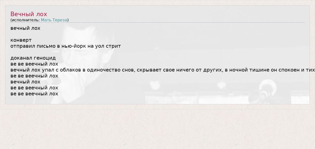вечный лох конверт отправил письмо в нью-йорк на уол стрит доканал геноцид ве ве веечный лох вечный лох упал с облаков в одиночество снов, скрывает свое ничего от других, в ночной тишине он спокоен и тих ве ве веечный лох вечный лох ве ве веечный лох ве ве веечный лох