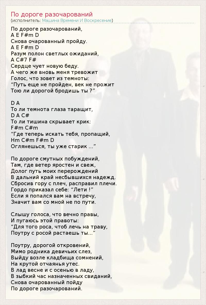 По дороге разочарований, A E F#m D Снова очарованный пройду. A E F#m D Разум полон светлых ожиданий, A C#7 F# Сердце чует новую беду. А чего же вновь меня тревожит Голос, что зовет из темноты: “Путь еще не пройден, век не прожит Тою ли дорогой бродишь ты ?” D A То ли темнота глаза таращит, D A C# То ли тишина скрывает крик: F#m C#m “Где теперь искать тебя, пропащий, Hm C#m F#m D Оглянешься, ты уже старик ...” По дороге смутных побуждений, Там, где ветер яростен и свеж, Долог путь моих перерождений В дальний край несбывшихся надежд. Сбросив гору с плеч, расправил плечи. Гордо приказал себе: “Лети !” Если я попался вам на встречу, Значит вам со мной не по пути. Слышу голоса, что вечно правы, И пугаюсь этой правоты: “Для того роса, чтоб лечь на траву, Поутру с росой растаешь ты...” Поутру, дорогой откровений, Мимо родника девичьих слез, Выйду возле кладбища сомнений, На крутой отчаянья утес. В лад весне и с осенью в ладу, В зыбкий час назначенных свиданий, Снова очарованный пойду По дороге разочарований.