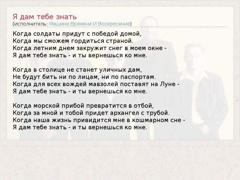 Когда солдаты придут с победой домой, Когда мы сможем гордиться страной. Когда летним днем закружит снег в моем окне - Я дам тебе знать - и ты вернешься ко мне. Когда в столице не станет уличных дам, Не будут бить ни по лицам, ни по паспортам. Когда для всех вождей мавзолей поставят на Луне - Я дам тебе знать - и ты вернешься ко мне. Когда морской прибой превратится в отбой, Когда за мной и тобой придет архангел с трубой. Когда наша жизнь привидится мне в кошмарном сне - Я дам тебе знать - и ты вернешься ко мне.