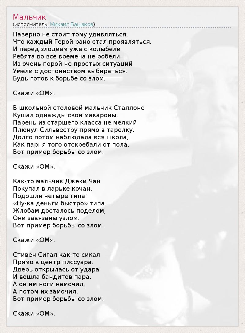 Наверно не стоит тому удивляться, Что каждый Герой рано стал проявляться. И перед злодеем уже с колыбели Ребята во все времена не робели. Из очень порой не простых ситуаций Умели с достоинством выбираться. Будь готов к борьбе со злом. Скажи «ОМ». В школьной столовой мальчик Сталлоне Кушал однажды свои макароны. Парень из старшего класса не мелкий Плюнул Сильвестру прямо в тарелку. Долго потом наблюдала вся школа, Как парня того отскребали от пола. Вот пример борьбы со злом. Скажи «ОМ». Как-то мальчик Джеки Чан Покупал в ларьке кочан. Подошли четыре типа: «Ну-ка деньги быстро» типа. Жлобам досталось поделом, Они завязаны узлом. Вот пример борьбы со злом. Скажи «ОМ». Стивен Сигал как-то сикал Прямо в центр писсуара. Дверь открылась от удара И вошла бандитов пара. А он им ноги намочил, А потом их замочил. Вот пример борьбы со злом. Скажи «ОМ».