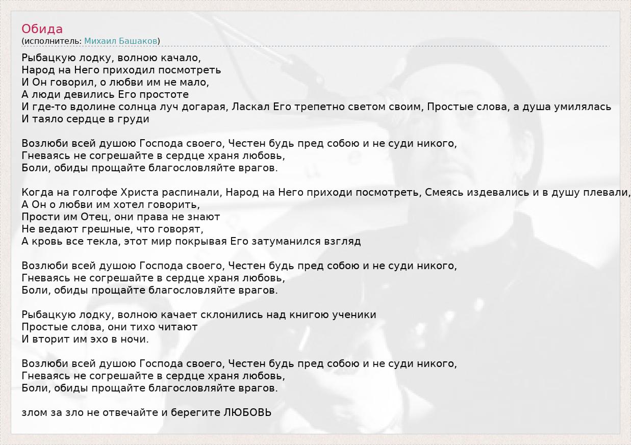 Рыбацкую лодку, волною качало, Народ на Него приходил посмотреть И Он говорил, о любви им не мало, А люди девились Его простоте И где-то вдолине солнца луч догарая, Ласкал Его трепетно светом своим, Простые слова, а душа умилялась И таяло сердце в груди Возлюби всей душою Господа своего, Честен будь пред собою и не суди никого, Гневаясь не согрешайте в сердце храня любовь, Боли, обиды прощайте благословляйте врагов. Когда на голгофе Христа распинали, Народ на Него приходи посмотреть, Смеясь издевались и в душу плевали, А Он о любви им хотел говорить, Прости им Отец, они права не знают Не ведают грешные, что говорят, А кровь все текла, этот мир покрывая Его затуманился взгляд Возлюби всей душою Господа своего, Честен будь пред собою и не суди никого, Гневаясь не согрешайте в сердце храня любовь, Боли, обиды прощайте благословляйте врагов. Рыбацкую лодку, волною качает склонились над книгою ученики Простые слова, они тихо читают И вторит им эхо в ночи. Возлюби всей душою Господа своего, Честен будь пред собою и не суди никого, Гневаясь не согрешайте в сердце храня любовь, Боли, обиды прощайте благословляйте врагов. злом за зло не отвечайте и берегите ЛЮБОВЬ