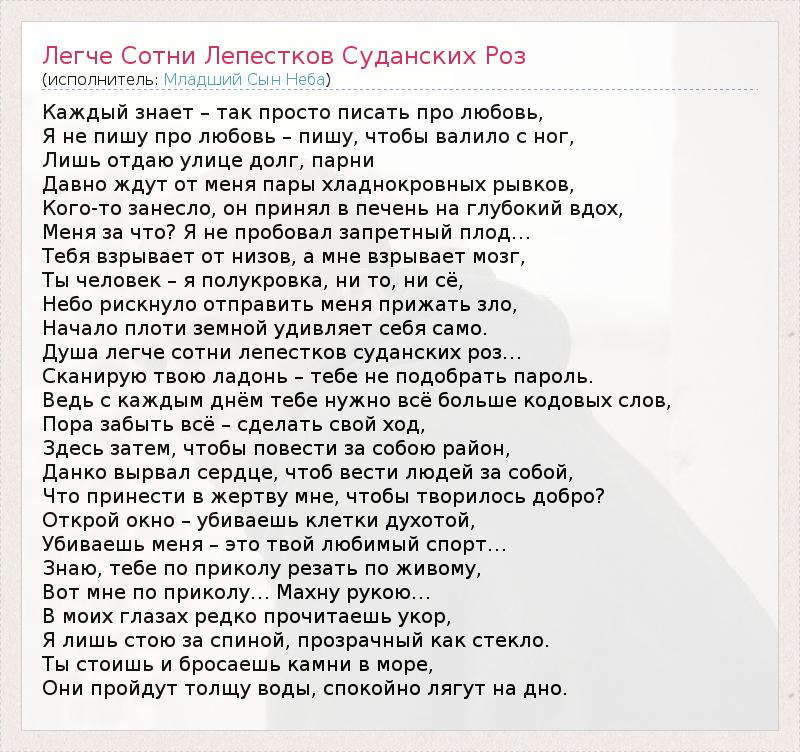 А как ты думаешь, о чем песня "Легче Сотни Лепестков Суданских Роз" ?