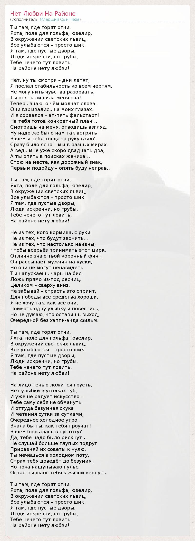 Ты там, где горят огни, Яхта, поле для гольфа, ювелир, В окружении светских львиц, Все улыбаются – просто шик! Я там, где пустые дворы, Люди искренни, но грубы, Тебе нечего тут ловить, На районе нету любви! Нет, ну ты смотри – дни летят, Я послал стабильность ко всем чертям, Не могу нить чувства разорвать, Ты опять лишила меня сна! Теперь знаю, о чём молчат слова – Они взрывались на моих глазах. И я сорвался – ап-пять фальстарт! На тебя готов конкретный план… Смотришь на меня, отводишь взгляд, Ну надо же было нам так встрять! Зачем я тебя тогда за руку взял?! Сразу было ясно – мы в разных мирах. А ведь мне уже скоро двадцать два, А ты опять в поисках жениха… Стою на месте, как дорожный знак, Первым подойду – опять буду неправ… Ты там, где горят огни, Яхта, поле для гольфа, ювелир, В окружении светских львиц, Все улыбаются – просто шик! Я там, где пустые дворы, Люди искренни, но грубы, Тебе нечего тут ловить, На районе нету любви! Не из тех, кого кормишь с руки, Не из тех, что будут звонить… Не из тех, что настолько наивны, Чтобы всерьёз принимать этот цирк. Отлично знаю твой коронный финт, Он рассыпает мужчин на куски, Но они не могут ненавидеть – Ты напускаешь чары на бис. Ложь прямо из-под ресниц. Целиком – сверху вниз, Не забывай – страсть это спринт, Для победы все средства хороши. Я не хочу так, как все они, Поймать одну улыбку и повестись, Но не думаю, что оставишь выход, Очередной без хэппи-энда фильм. Ты там, где горят огни, Яхта, поле для гольфа, ювелир, В окружении светских львиц, Все улыбаются – просто шик! Я там, где пустые дворы, Люди искренни, но грубы, Тебе нечего тут ловить, На районе нету любви! На лицо тенью ложится грусть, Нет улыбки в уголках губ, И уже не радует искусство – Тебе саму себя не обмануть. И оттуда безумная скука И метания сутки за сутками, Очередное холодное утро, Знала бы ты, как тебя проучат! Зачем бросалась в пустоту? Да, тебе надо было рискнуть! Не слушай больше глупых подруг Приравняй их советы к нулю. Ты мечешься в холодном поту, Страх тебя доведёт до безумия, Но пока нащупываю пульс, Остаётся шанс тебя к жизни вернуть. Ты там, где горят огни, Яхта, поле для гольфа, ювелир, В окружении светских львиц, Все улыбаются – просто шик! Я там, где пустые дворы, Люди искренни, но грубы, Тебе нечего тут ловить, На районе нету любви!