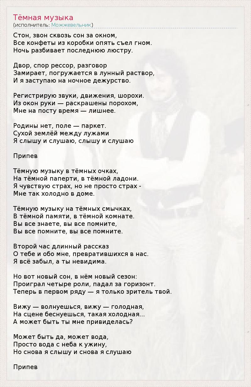 Стон, звон сквозь сон за окном, Все конфеты из коробки опять съел гном. Ночь разбивает последнюю люстру. Двор, спор рессор, разговор Замирает, погружается в лунный раствор, И я заступаю на ночное дежурство. Регистрирую звуки, движения, шорохи. Из окон руки — раскрашены порохом, Мне на посту время — лишнее. Родины нет, поле — паркет. Сухой землёй между лужами Я слышу и слушаю, слышу и слушаю Припев Тёмную музыку в тёмных очках, На тёмной паперти, в тёмной ладони. Я чувствую страх, но не просто страх - Мне так холодно в доме. Тёмную музыку на тёмных смычках, В тёмной памяти, в тёмной комнате. Вы все знаете, вы все помните, Вы все помните, вы все помните. Второй час длинный рассказ О тебе и обо мне, превратившихся в нас. Я всё забыл, а ты невидима. Но вот новый сон, в нём новый сезон: Проиграл четыре роли, падал за горизонт. Теперь в первом ряду — я только зритель твой. Вижу — волнуешься, вижу — голодная, На сцене беснуешься, такая холодная... А может быть ты мне привиделась? Может быть да, может вода, Просто вода с неба к ужину, Но снова я слышу и снова я слушаю Припев