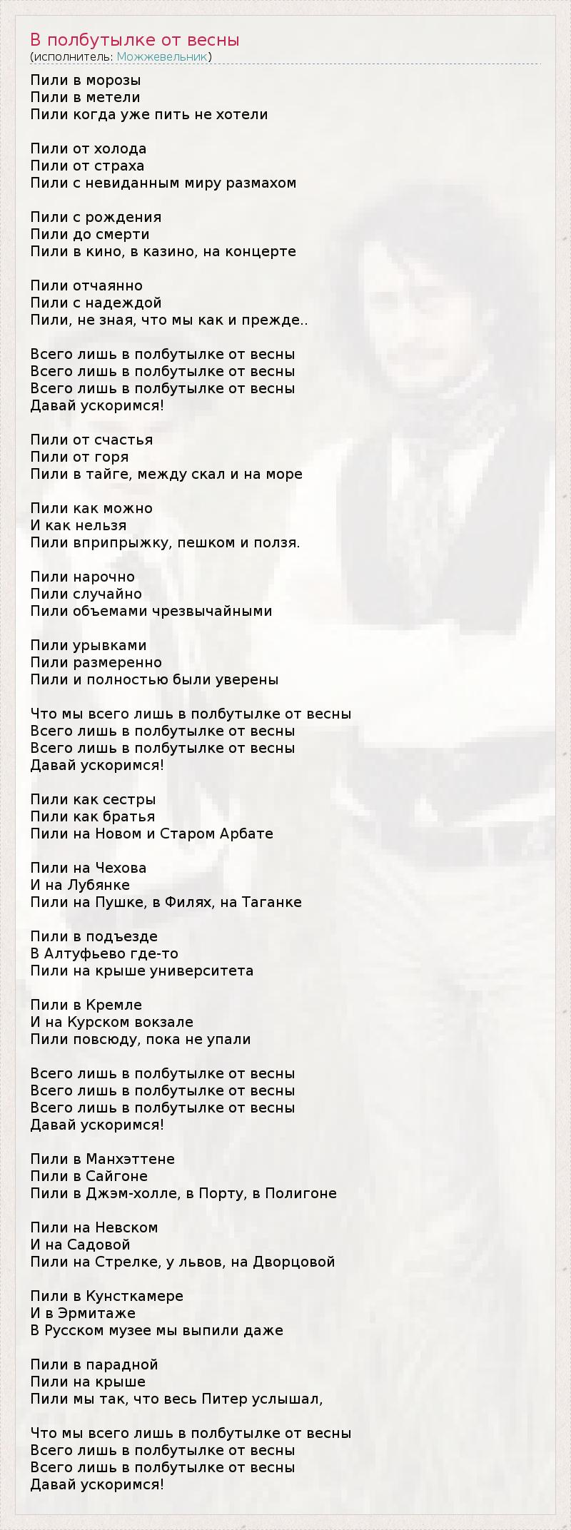 Пили в морозы Пили в метели Пили когда уже пить не хотели Пили от холода Пили от страха Пили с невиданным миру размахом Пили с рождения Пили до смерти Пили в кино, в казино, на концерте Пили отчаянно Пили с надеждой Пили, не зная, что мы как и прежде.. Всего лишь в полбутылке от весны Всего лишь в полбутылке от весны Всего лишь в полбутылке от весны Давай ускоримся! Пили от счастья Пили от горя Пили в тайге, между скал и на море Пили как можно И как нельзя Пили вприпрыжку, пешком и ползя. Пили нарочно Пили случайно Пили объемами чрезвычайными Пили урывками Пили размеренно Пили и полностью были уверены Что мы всего лишь в полбутылке от весны Всего лишь в полбутылке от весны Всего лишь в полбутылке от весны Давай ускоримся! Пили как сестры Пили как братья Пили на Новом и Старом Арбате Пили на Чехова И на Лубянке Пили на Пушке, в Филях, на Таганке Пили в подъезде В Алтуфьево где-то Пили на крыше университета Пили в Кремле И на Курском вокзале Пили повсюду, пока не упали Всего лишь в полбутылке от весны Всего лишь в полбутылке от весны Всего лишь в полбутылке от весны Давай ускоримся! Пили в Манхэттене Пили в Сайгоне Пили в Джэм-холле, в Порту, в Полигоне Пили на Невском И на Садовой Пили на Стрелке, у львов, на Дворцовой Пили в Кунсткамере И в Эрмитаже В Русском музее мы выпили даже Пили в парадной Пили на крыше Пили мы так, что весь Питер услышал, Что мы всего лишь в полбутылке от весны Всего лишь в полбутылке от весны Всего лишь в полбутылке от весны Давай ускоримся!