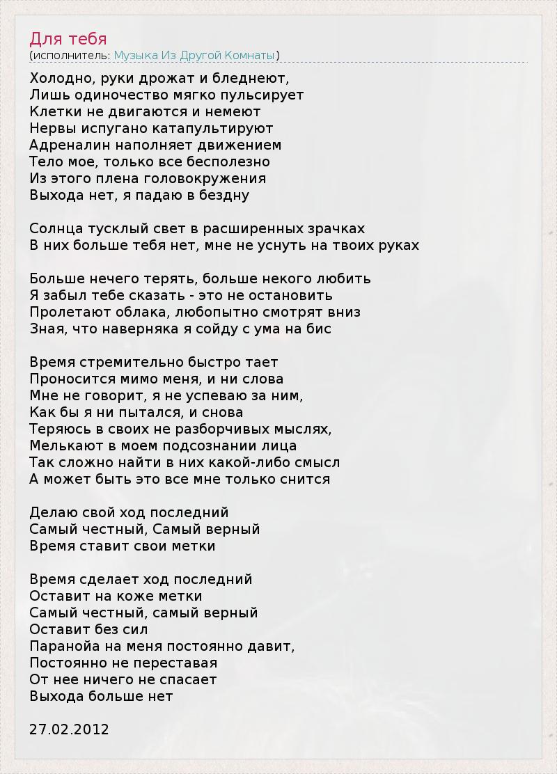 Холодно, руки дрожат и бледнеют, Лишь одиночество мягко пульсирует Клетки не двигаются и немеют Нервы испугано катапультируют Адреналин наполняет движением Тело мое, только все бесполезно Из этого плена головокружения Выхода нет, я падаю в бездну Солнца тусклый свет в расширенных зрачках В них больше тебя нет, мне не уснуть на твоих руках Больше нечего терять, больше некого любить Я забыл тебе сказать - это не остановить Пролетают облака, любопытно смотрят вниз Зная, что наверняка я сойду с ума на бис Время стремительно быстро тает Проносится мимо меня, и ни слова Мне не говорит, я не успеваю за ним, Как бы я ни пытался, и снова Теряюсь в своих не разборчивых мыслях, Мелькают в моем подсознании лица Так сложно найти в них какой-либо смысл А может быть это все мне только снится Делаю свой ход последний Самый честный, Самый верный Время ставит свои метки Время сделает ход последний Оставит на коже метки Самый честный, самый верный Оставит без сил Паранойа на меня постоянно давит, Постоянно не переставая От нее ничего не спасает Выхода больше нет 27.02.2012