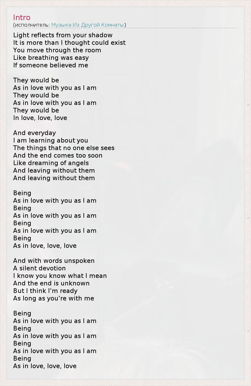 Light reflects from your shadow It is more than I thought could exist You move through the room Like breathing was easy If someone believed me They would be As in love with you as I am They would be As in love with you as I am They would be In love, love, love And everyday I am learning about you The things that no one else sees And the end comes too soon Like dreaming of angels And leaving without them And leaving without them Being As in love with you as I am Being As in love with you as I am Being As in love with you as I am Being As in love, love, love And with words unspoken A silent devotion I know you know what I mean And the end is unknown But I think I'm ready As long as you're with me Being As in love with you as I am Being As in love with you as I am Being As in love with you as I am Being As in love, love, love