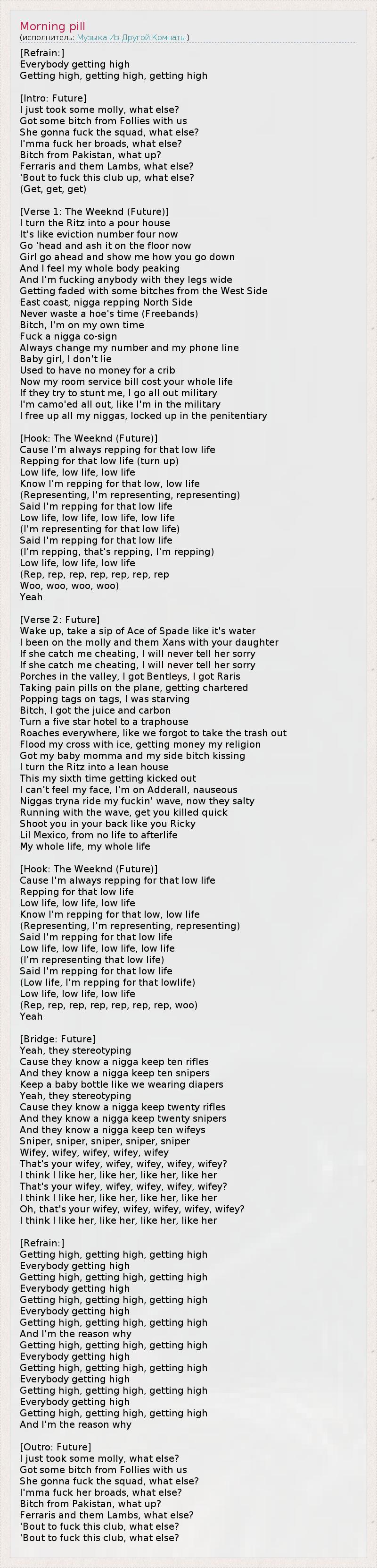 [Рефрен:] Все ловят кайф. Кайфуют, кайфуют, кайфуют. [Вступление:] Я только что принял молли, 1 что еще? С нами несколько с*чек из Фоллис. 2 Она перее*лась со всем движем, что еще? Я трахнул ее подружек-шлюшек, что еще? С*ка из Пакистана, что еще? Феррари и Ламборгини, 3 что еще? Собираемся оттянуться в этом клубе, что еще? (Да, да, да). [Куплет 1: The Weeknd (Future)] Я превращаю Ритц в богодельню, 4 Похоже, теперь меня выселят четвертый раз. Продолжаем и сейчас пепел летит на пол. Детка, смелее, покажи мне, как ты работаешь ртом. 5 А я чувствую, как все мое тело на вершине, И я тр*хаю любую, кто расставит ноги широко. Кайфую с несколькими с*чками с Запада. Н*гер с восточного побережья представляет Север. Никогда не трачу время шлюхи (Фрибэндс). 6 С*ка, я думаю о своем времени. Н*гер, на х*й договора. Всегда меняю свой номер и телефонную линию. Малышка, я не вру. Раньше не хватало денег на жилье, Сейчас мой чек по обслуживанию номеров стоит, как вся твоя жизнь. Если меня попытаются остановить, я брошу все силы на вооружение. Я весь в камуфляже, словно вояка. Я освобождаю всех своих н*геров, упрятанных за решетку на зоне. [Припев: The Weeknd (Future)] Ведь я всегда представляю собой подонка. Представляю подонка (нет ничего святого). Подонок, подонок, подонок. Знаю, я олицетворяю подонка, подонка. (Олицетворяю, олицетворяю, олицетворяю). Сказал же, я представляю собой подонка, Подонка, подонка, подонка. (Я олицетворяю подонка). Сказал же, я представляю собой подонка, (Я представляю, представляю, представляю), Подонка, подонка, подонка. (Да, да, да, да, да, да, да, Ву, ву, ву, ву). Ага. [Куплет 2: Future] Заставлю других потягивать Туз Пик, как воду. 7 Я был под молли и закидывался Ксаном 8 с твоей дочуркой. Если она застанет, как я ей изменяю, никогда попрошу прощения. Если она застанет, как я ей изменяю, никогда попрошу прощения. Порши в долине, у меня есть Бентли, есть Рари. 8 Принимаю обезболивающие на самолете, взятом напрокат. Я жаждал менять шмотки одну за другой. С*ка, меня уважают и у меня есть ствол. 9 Превратил пяти звездочный отель в бомжатник, Повсюду косяки, словно мы забыли вынести мусор. 10 Отделал крест камнями, моя религия - зарабатывать бабки. Рядом моя девушка и любовница сосутся. Я превращаю Ритц в дом лина. 11 Меня выгоняют шестой раз. Я не чувствую лица, я под аддералом, 12 тошнит. Н*геры пытаются поймать мою чертову волну, теперь они злятся. Я быстро вас завалю, настигнув, как волна. Стрельну вам в спину, как Рики. 13 Из никакой жизни в Мини Мексике я пришел к новой. 14 Вот вся моя жизнь, вся моя жизнь. [Припев: The Weeknd (Future)] Ведь я всегда представляю собой подонка. Представляю подонка (нет ничего святого). Подонок, подонок, подонок. Знаю, я олицетворяю подонка, подонка. (Олицетворяю, олицетворяю, олицетворяю). Сказал же, я представляю собой подонка, Подонка, подонка, подонка. (Я олицетворяю подонка). Сказал же, я представляю собой подонка, (Я представляю, представляю, представляю), Подонка, подонка, подонка. (Да, да, да, да, да, да, да, ву). Ага. [Переход: Future] Ага, другие мыслят стереотипами, Ведь знают, что н*гер хранит десять винтовок, И знают, что у н*гера есть десять снайперок. И, что он держится за сиськи подруги, 15 словно на нем памперсы. Даа, другие мыслят стереотипами, Ведь знают, что н*гер хранит двадцать винтовок И знают, что у н*гера есть двадцать снайперок, И знают, что у н*гера есть десять женушек. Снайперка, снайперка, сна