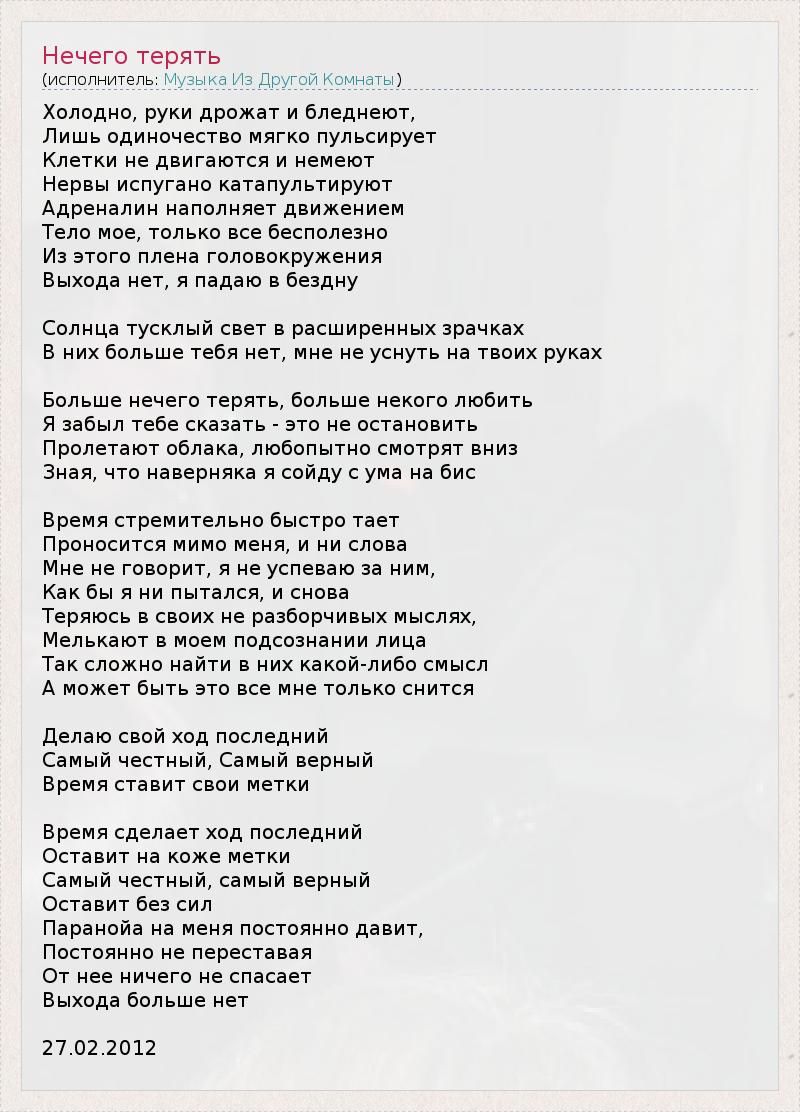 Холодно, руки дрожат и бледнеют, Лишь одиночество мягко пульсирует Клетки не двигаются и немеют Нервы испугано катапультируют Адреналин наполняет движением Тело мое, только все бесполезно Из этого плена головокружения Выхода нет, я падаю в бездну Солнца тусклый свет в расширенных зрачках В них больше тебя нет, мне не уснуть на твоих руках Больше нечего терять, больше некого любить Я забыл тебе сказать - это не остановить Пролетают облака, любопытно смотрят вниз Зная, что наверняка я сойду с ума на бис Время стремительно быстро тает Проносится мимо меня, и ни слова Мне не говорит, я не успеваю за ним, Как бы я ни пытался, и снова Теряюсь в своих не разборчивых мыслях, Мелькают в моем подсознании лица Так сложно найти в них какой-либо смысл А может быть это все мне только снится Делаю свой ход последний Самый честный, Самый верный Время ставит свои метки Время сделает ход последний Оставит на коже метки Самый честный, самый верный Оставит без сил Паранойа на меня постоянно давит, Постоянно не переставая От нее ничего не спасает Выхода больше нет 27.02.2012