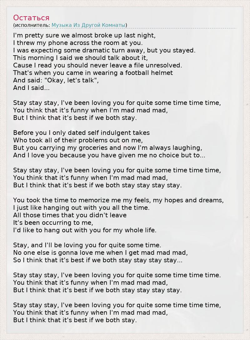 Мы почти расстались вчера вечером, я уверена, Я метнула в тебя телефон через всю комнату. Я ожидала какого-то драматичного ухода, но ты остался. Этим утром я сказала, что нам нужно поговорить, Потому что я читала, что не нужно оставлять дела неразрешёнными. И тогда вошёл ты с футбольным шлемом на голове И сказал: "Давай поговорим", А я ответила... Останься, я уже давно люблю тебя. Ты думаешь, что это забавно, когда я сержусь, Я думаю, будет лучше, если мы останемся вместе. До тебя я встречалась только с самовлюблёнными эгоистами, 1 Которые перекладывали свои проблемы на меня. Ты же носишь сумки с продуктами, и теперь я всё время смеюсь. И я люблю тебя, ведь ты не оставляешь мне выбора, кроме как... Остаться, я уже давно люблю тебя. Ты думаешь, что это забавно, когда я сержусь, Я думаю, будет лучше, если мы останемся вместе. Ты постепенно изучал меня, запоминал мои чувства, надежды и мечты. Мне просто нравится болтаться с тобой всё время. Каждый раз, когда ты не уходил, Мне приходило в голову, Что я хочу вот так жить с тобой всю свою жизнь... Останься, и я буду долго любить тебя. Никто другой не станет любить меня, когда я сержусь, Я думаю, что будет лучше, если мы останемся вместе... Останься, я уже давно люблю тебя. Ты думаешь, что это забавно, когда я сержусь, Я думаю, будет лучше, если мы останемся вместе. Останься, я уже давно люблю тебя. Ты думаешь, что это забавно, когда я сержусь, Я думаю, будет лучше, если мы останемся вместе. 1 - дословно: кадры, потворствующие своим прихотям