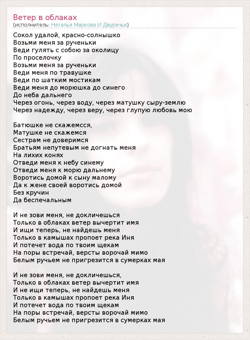 Сокол удалой, красно-солнышко Возьми меня за рученьки Веди гулять с собою за околицу По проселочку Возьми меня за рученьки Веди меня по травушке Веди по шатким мостикам Веди меня до морюшка до синего До неба дальнего Через огонь, через воду, через матушку сыру-землю Через надежду, через веру, через глупую любовь мою Батюшке не скажемсся, Матушке не скажемся Сестрам не доверимся Братьям непутевым не догнать меня На лихих конях Отведи меня к небу синему Отведи меня к морю дальнему Воротись домой к сыну малому Да к жене своей воротись домой Без кручин Да беспечальным И не зови меня, не докличешься Только в облаках ветер вычертит имя И ищи теперь, не найдешь меня Только в камышах пропоет река Иня И потечет вода по твоим щекам На поры встречай, версты ворочай мимо Белым ручьем не пригрезится в сумерках мая И не зови меня, не докличешься, Только в облаках ветер вычертит имя И не ищи теперь, не найдешь меня Только в камышах пропоет река Иня И потечет вода по твоим щекам На поры встречай, версты ворочай мимо Белым ручьем не пригрезится в сумерках мая