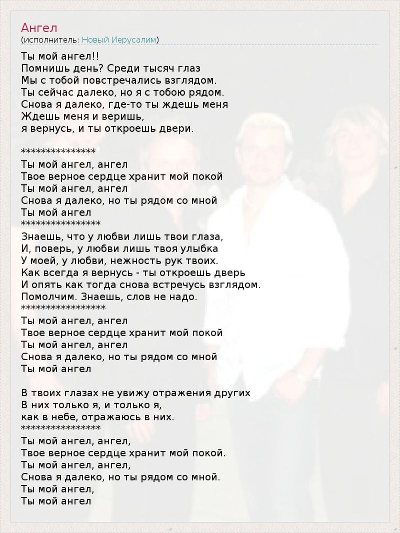 Ты мой ангел!! Помнишь день? Среди тысяч глаз Мы с тобой повстречались взглядом. Ты сейчас далеко, но я с тобою рядом. Снова я далеко, где-то ты ждешь меня Ждешь меня и веришь, я вернусь, и ты откроешь двери. *************** Ты мой ангел, ангел Твое верное сердце хранит мой покой Ты мой ангел, ангел Снова я далеко, но ты рядом со мной Ты мой ангел **************** Знаешь, что у любви лишь твои глаза, И, поверь, у любви лишь твоя улыбка У моей, у любви, нежность рук твоих. Как всегда я вернусь - ты откроешь дверь И опять как тогда снова встречусь взглядом. Помолчим. Знаешь, слов не надо. ***************** Ты мой ангел, ангел Твое верное сердце хранит мой покой Ты мой ангел, ангел Снова я далеко, но ты рядом со мной Ты мой ангел В твоих глазах не увижу отражения других В них только я, и только я, как в небе, отражаюсь в них. **************** Ты мой ангел, ангел, Твое верное сердце хранит мой покой. Ты мой ангел, ангел, Снова я далеко, но ты рядом со мной. Ты мой ангел, Ты мой ангел