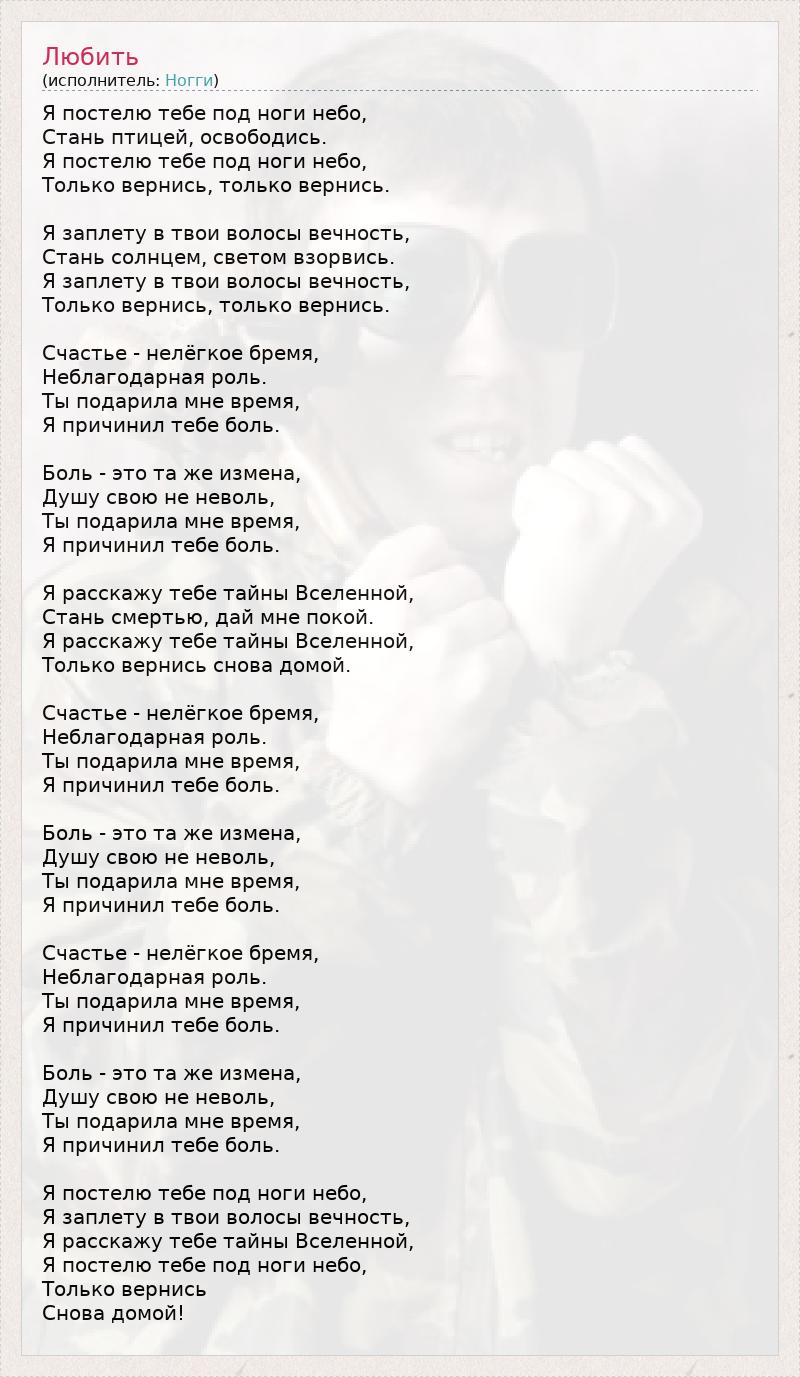 Я постелю тебе под ноги небо, Стань птицей, освободись. Я постелю тебе под ноги небо, Только вернись, только вернись. Я заплету в твои волосы вечность, Cтань солнцем, светом взорвись. Я заплету в твои волосы вечность, Только вернись, только вернись. Счастье - нелёгкое бремя, Неблагодарная роль. Ты подарила мне время, Я причинил тебе боль. Боль - это та же измена, Душу свою не неволь, Ты подарила мне время, Я причинил тебе боль. Я расскажу тебе тайны Вселенной, Стань смертью, дай мне покой. Я расскажу тебе тайны Вселенной, Только вернись снова домой. Счастье - нелёгкое бремя, Неблагодарная роль. Ты подарила мне время, Я причинил тебе боль. Боль - это та же измена, Душу свою не неволь, Ты подарила мне время, Я причинил тебе боль. Счастье - нелёгкое бремя, Неблагодарная роль. Ты подарила мне время, Я причинил тебе боль. Боль - это та же измена, Душу свою не неволь, Ты подарила мне время, Я причинил тебе боль. Я постелю тебе под ноги небо, Я заплету в твои волосы вечность, Я расскажу тебе тайны Вселенной, Я постелю тебе под ноги небо, Только вернись Снова домой!