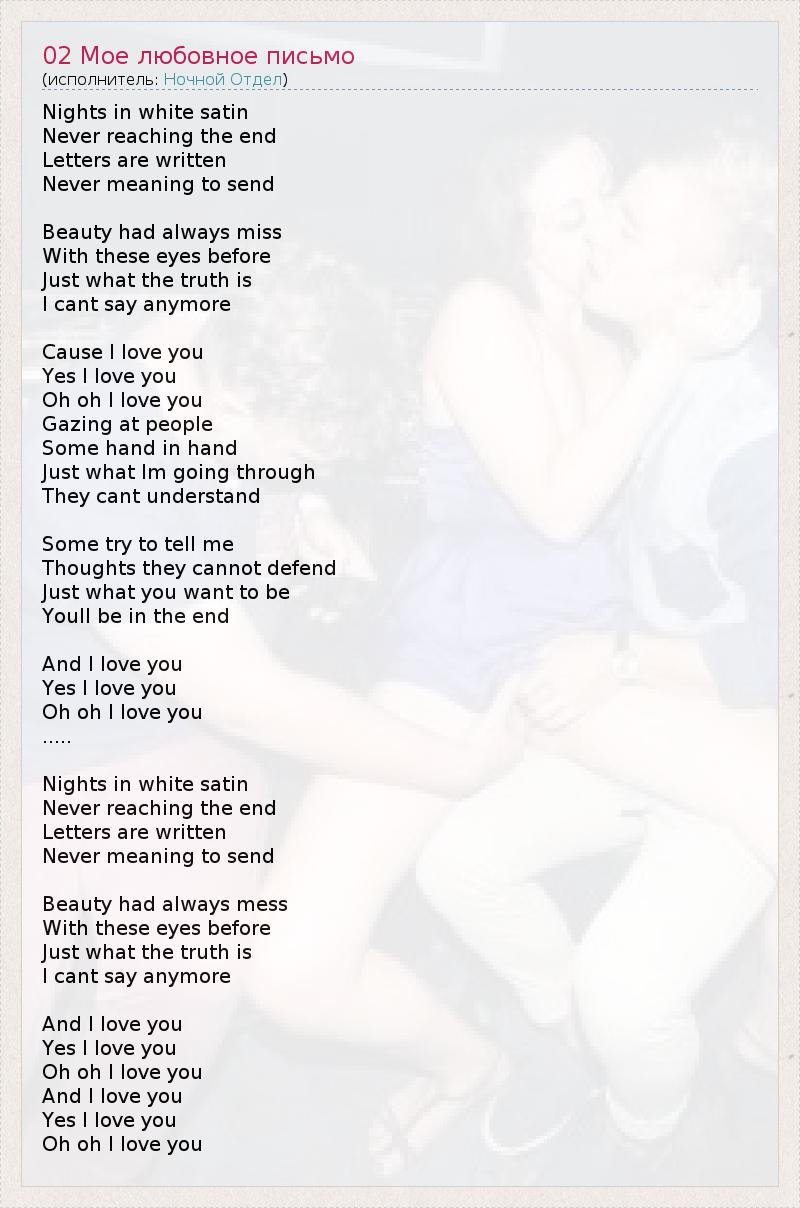 Ночи в белом атласе Ночи без конца, Любовные письма написаны Но так и не посланы Красота, которую я не замечал Были мои глаза слепы Даже что есть правда Я сказать боле не могу И все лишь потому, что Люблю я тебя, О, как я люблю Гляжу на людей, Держащихся за руки, Они могут понять, Через что я прошел Кто-то пытается доказать мне, То что недоказуемо, Просто кем ты хочешь быть, Ты будешь потом. И я люблю тебя, Да, я люблю тебя, О, как же я люблю тебя, О, как же я люблю тебя. Ночи в белом атласе Ночи без конца, Любовные письма написаны Но так и не посланы Красота, которую я не замечал Были мои глаза слепы Даже что есть правда Я сказать боле не могу И все лишь потому, что Люблю я тебя, О, как я люблю