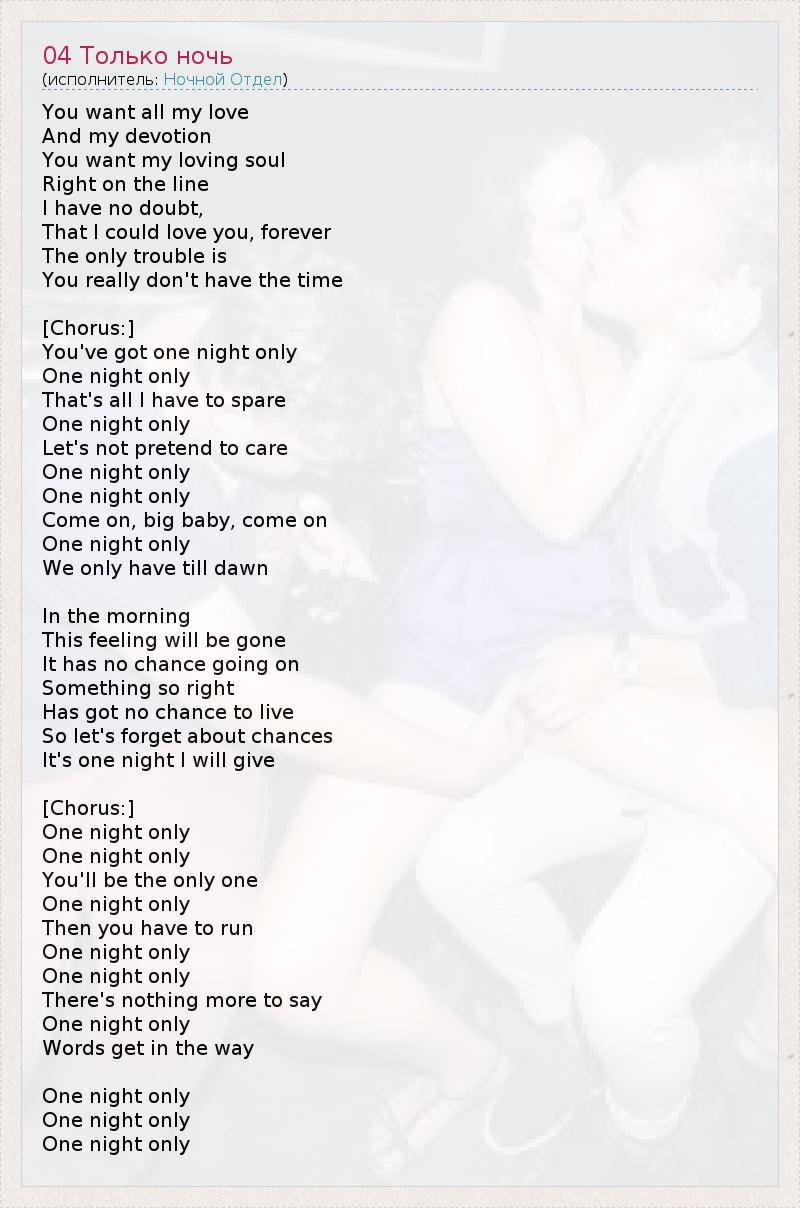 Тебе нужна вся моя любовь И преданность, Ты хочешь, чтобы я отдала тебе свою любящую душу, То есть всё и сразу... Я не сомневаюсь, Что cмогу любить тебя вечно, Но проблема в том, Что на самом деле у тебя нет времени... [Припев:] У тебя есть только одна ночь, Только одна ночь, Вот всё, что я могу подарить тебе. Только одна ночь - Давай не будем притворяться, что нам не все равно Только одну ночь, Только одну ночь... Ну же, детка, иди ко мне скорее, Только одна ночь, У нас времени всего лишь до рассвета... Утром Это чувство уйдет, У него нет шансов на продолжение. Что-то столь правильное Не имеет шансов на существование. Так что давай забудем о возможностях, Я дам тебе лишь одну ночь... [Припев:] Только одну ночь, Только одну ночь, Ты будешь единственным Только одну ночь, Затем ты должен будешь уйти... Только одна ночь, Только одна ночь, Больше нечего сказать - Только одна ночь... Слова нам - помеха. Только одна ночь, Только одна ночь, Только одна ночь...