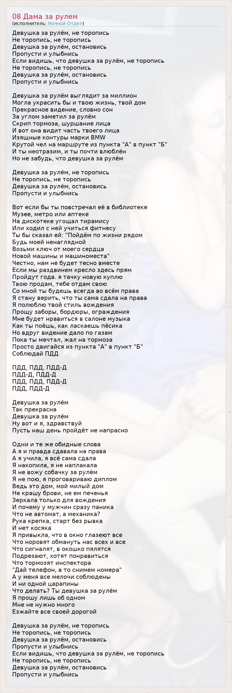 Девушка за рулём, не торопись Не торопись, не торопись Девушка за рулём, остановись Пропусти и улыбнись Если видишь, что девушка за рулём, не торопись Не торопись, не торопись Девушка за рулём, остановись Пропусти и улыбнись Девушка за рулём выглядит за миллион Могла украсить бы и твою жизнь, твой дом Прекрасное видение, словно сон За углом заметил за рулём Скрип тормоза, шуршание лица И вот она видит часть твоего лица Изящные контуры марки BMW Крутой чел на маршруте из пункта "А" в пункт "Б" И ты неотразим, и ты почти влюблён Но не забудь, что девушка за рулём Девушка за рулём, не торопись Не торопись, не торопись Девушка за рулём, остановись Пропусти и улыбнись Вот если бы ты повстречал её в библиотеке Музее, метро или аптеке На дискотеке угощал тирамису Или ходил с ней учиться фитнесу Ты бы сказал ей: "Пойдём по жизни рядом Будь моей ненаглядной Возьми ключ от моего сердца Новой машины и машиноместа" Честно, нам не будет тесно вместе Если мы раздвинем кресло здесь прям Пройдут года. я тачку новую куплю Твою продам, тебе отдам свою Со мной ты будешь всегда во всём права Я стану верить, что ты сама сдала на права Я полюблю твой стиль вождения Прощу заборы, бордюры, ограждения Мне будет нравиться в салоне музыка Как ты поёшь, как ласкаешь пёсика Но вдруг видение дало по газам Пока ты мечтал, жал на тормоза Просто двигайся из пункта "А" в пункт "Б" Соблюдай ПДД ПДД, ПДД, ПДД-Д ПДД-Д, ПДД-Д ПДД, ПДД, ПДД-Д ПДД, ПДД-Д Девушка за рулём Так прекрасна Девушка за рулём Ну вот и я, здравствуй Пусть наш день пройдёт не напрасно Одни и те же обидные слова А я и правда сдавала на права А я учила, я всё сама сдала Я накопила, я не наплакала Я не вожу собачку за рулём Я не пою, я проговариваю диплом Ведь это дом, мой милый дом Не крашу брови, не ем печенья Зеркала только для вождения И почему у мужчин сразу паника Что не автомат, а механика? Рука крепка, старт без рывка И нет косяка Я привыкла, что в окно глазеют все Что норовят обмануть нас всех и все Что сигналят, в окошко пялятся Подрезают, хотят понравиться Что тормозят инспектора "Дай телефон, а то снимем номера" А у меня все мелочи соблюдены И ни одной царапины Что делать? Ты девушка за рулём Я прошу лишь об одном Мне не нужно много Езжайте все своей дорогой Девушка за рулём, не торопись Не торопись, не торопись Девушка за рулём, остановись Пропусти и улыбнись Если видишь, что девушка за рулём, не торопись Не торопись, не торопись Девушка за рулём, остановись Пропусти и улыбнись