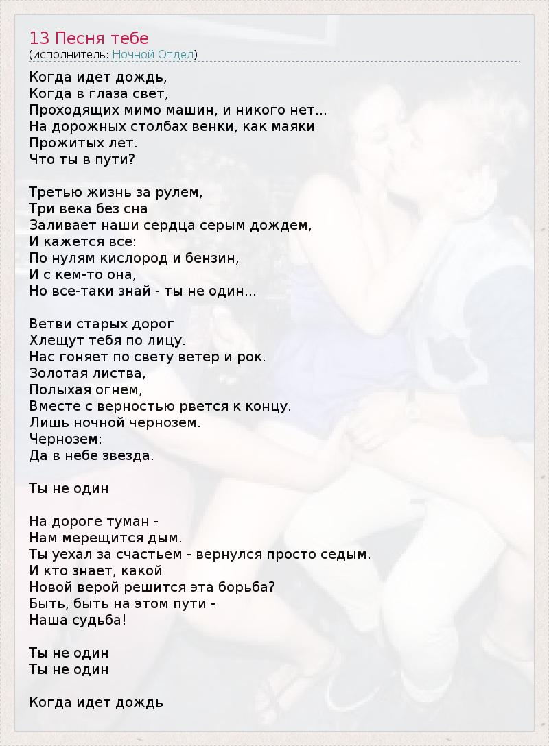 Когда идет дождь, Когда в глаза свет, Проходящих мимо машин, и никого нет... На дорожных столбах венки, как маяки Прожитых лет. Что ты в пути? Третью жизнь за рулем, Три века без сна Заливает наши сердца серым дождем, И кажется все: По нулям кислород и бензин, И с кем-то она, Но все-таки знай - ты не один... Ветви старых дорог Хлещут тебя по лицу. Нас гоняет по свету ветер и рок. Золотая листва, Полыхая огнем, Вместе с верностью рвется к концу. Лишь ночной чернозем. Чернозем: Да в небе звезда. Ты не один На дороге туман - Нам мерещится дым. Ты уехал за счастьем - вернулся просто седым. И кто знает, какой Новой верой решится эта борьба? Быть, быть на этом пути - Наша судьба! Ты не один Ты не один Когда идет дождь